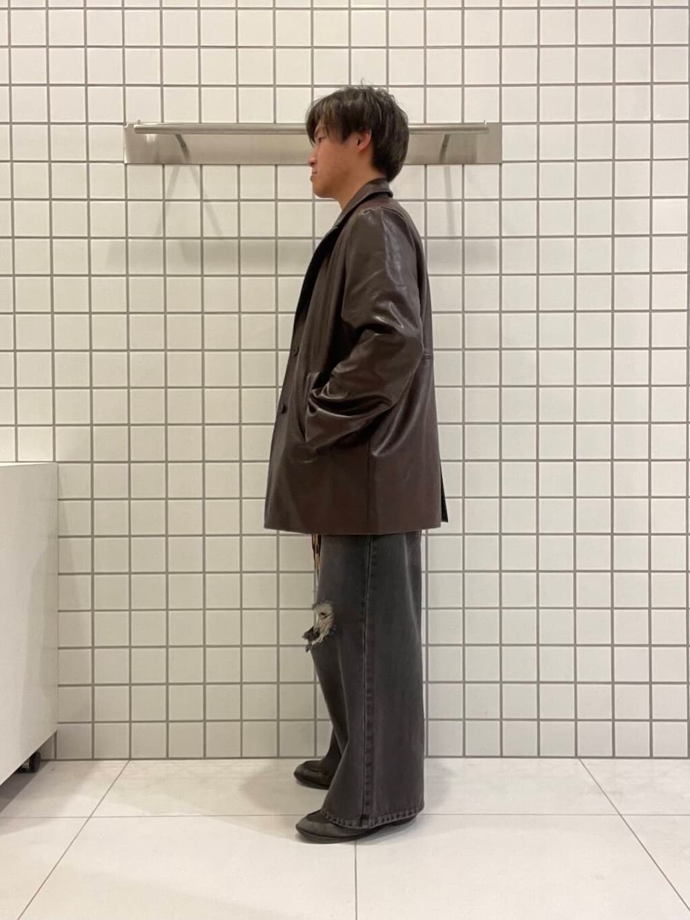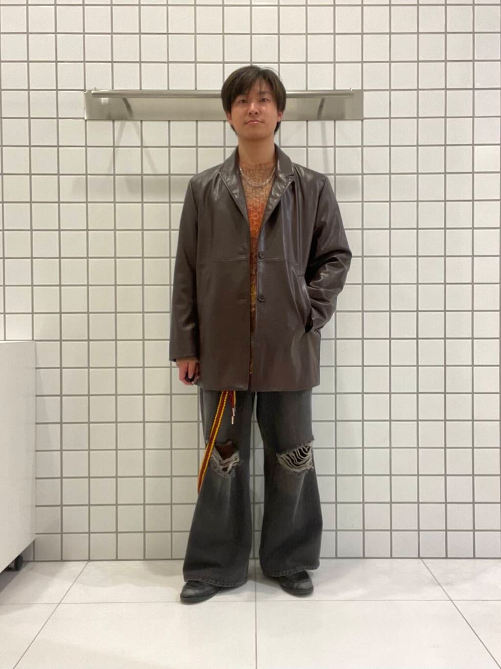 冬の定番アイテムのグラデーションニットにブラウンのレザージャケットとダメージデニムを合わせ、今年流行りの古着スタイルっぽいコーデにしてみました!!
