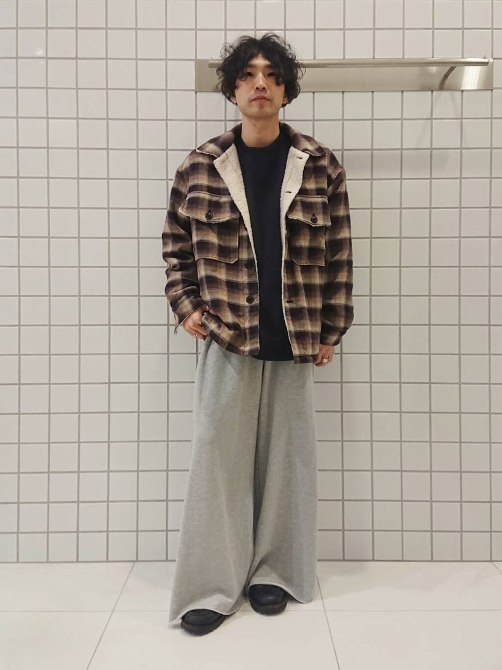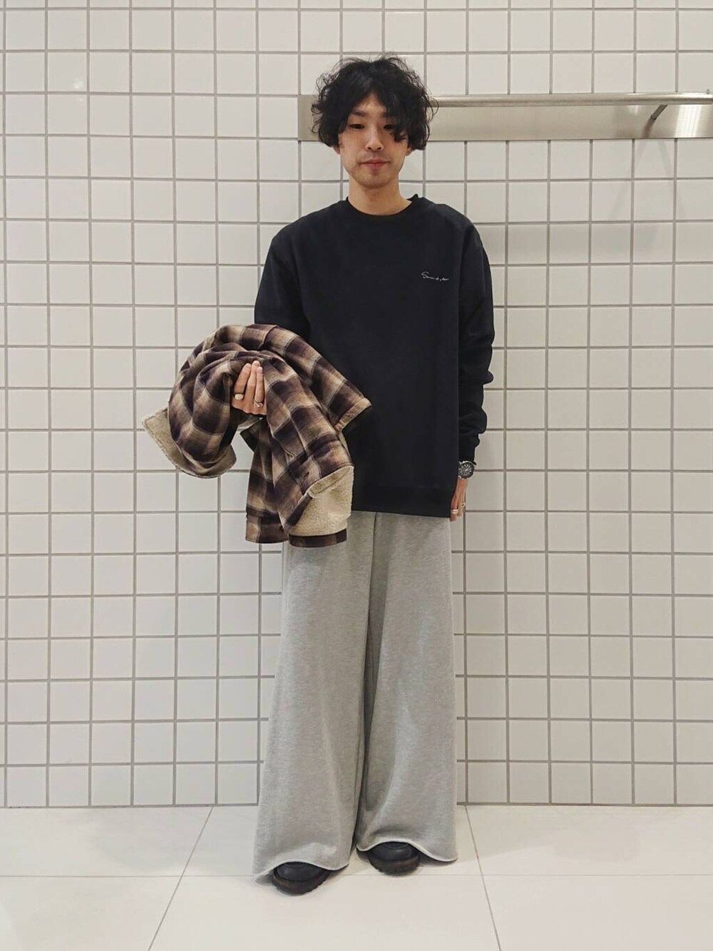 チェックジャケット×スウェットパンツ。