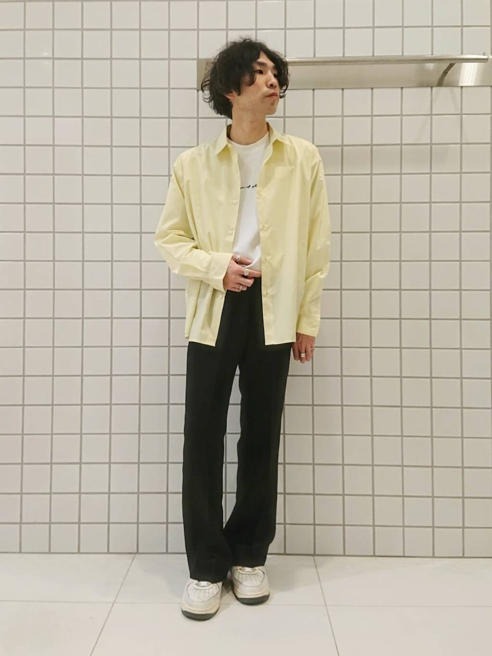 シャツは春カラーで1枚で映え、スラックス合わせでシンプルにきれいめスタイリングになります○