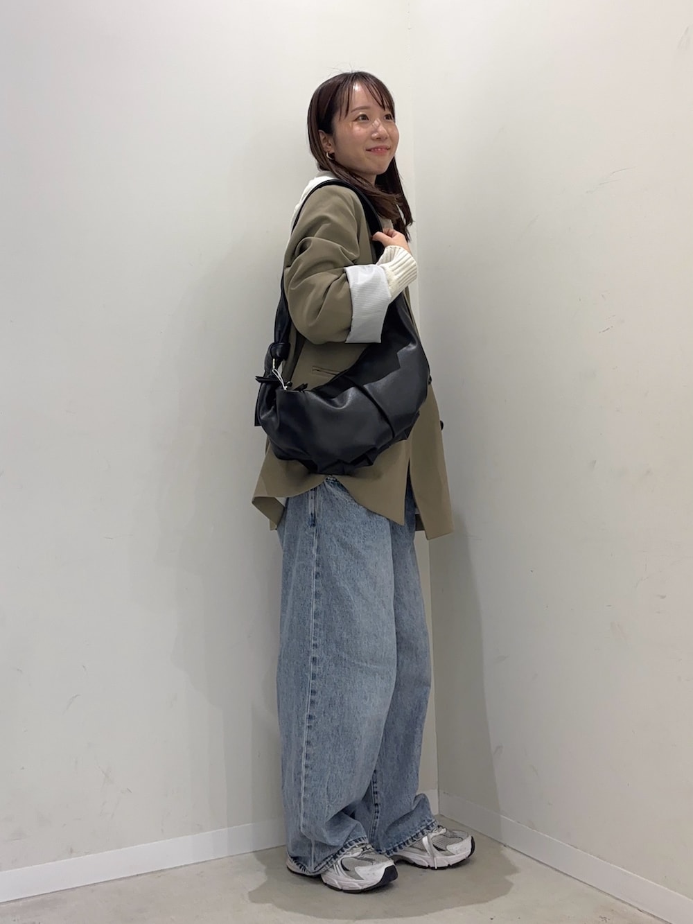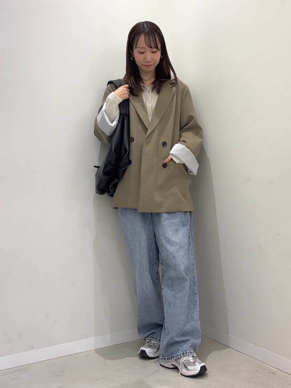 インナーにフード付きのトップスを着用し、カジュアルさをアップ!
