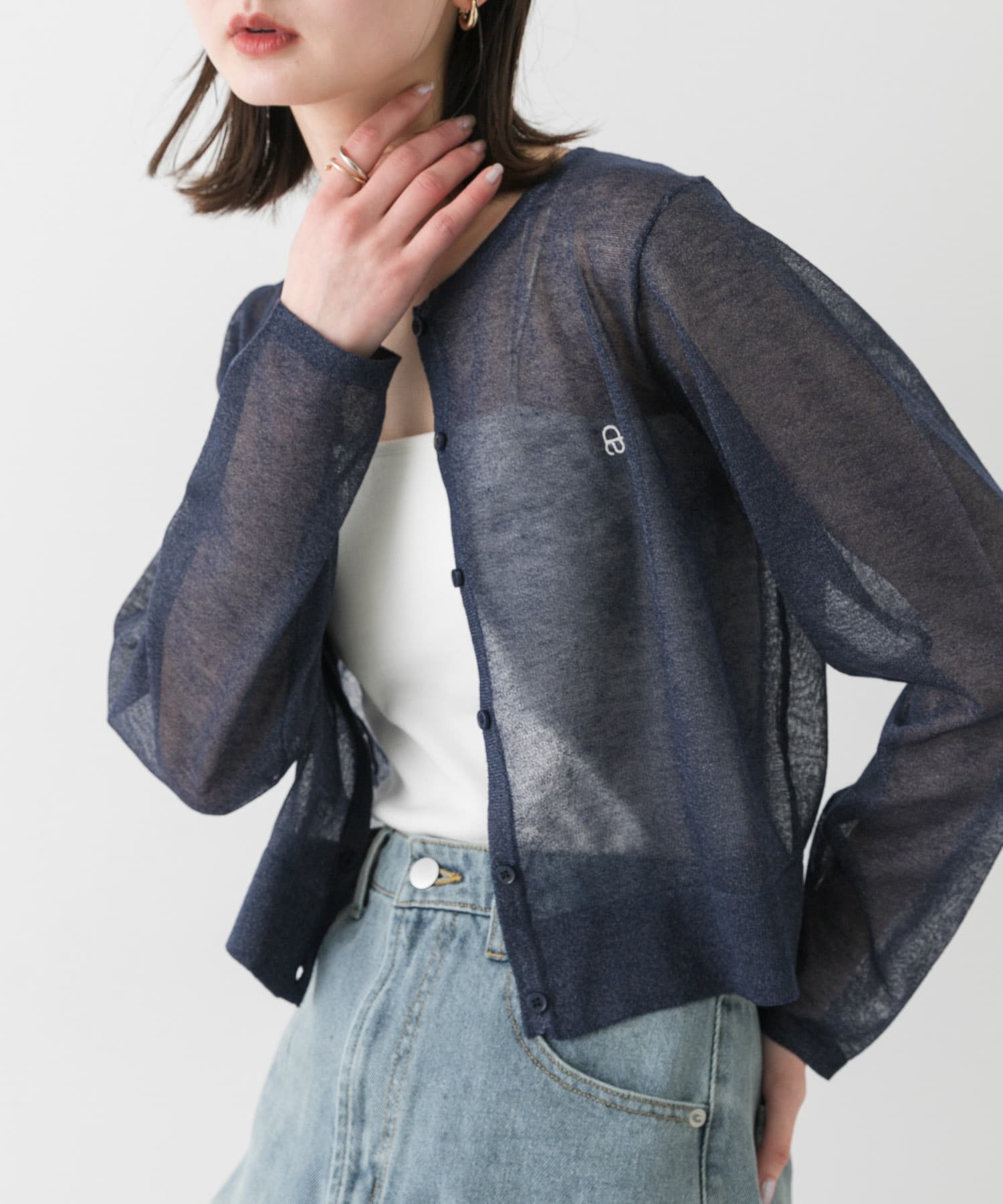 トップスはさりげないラメが大人っぽいシアーカーディガン🎀インナーにロゴTを合わせるのもおすすめ!