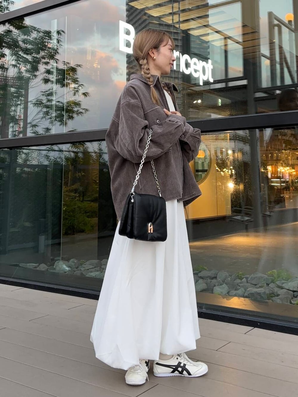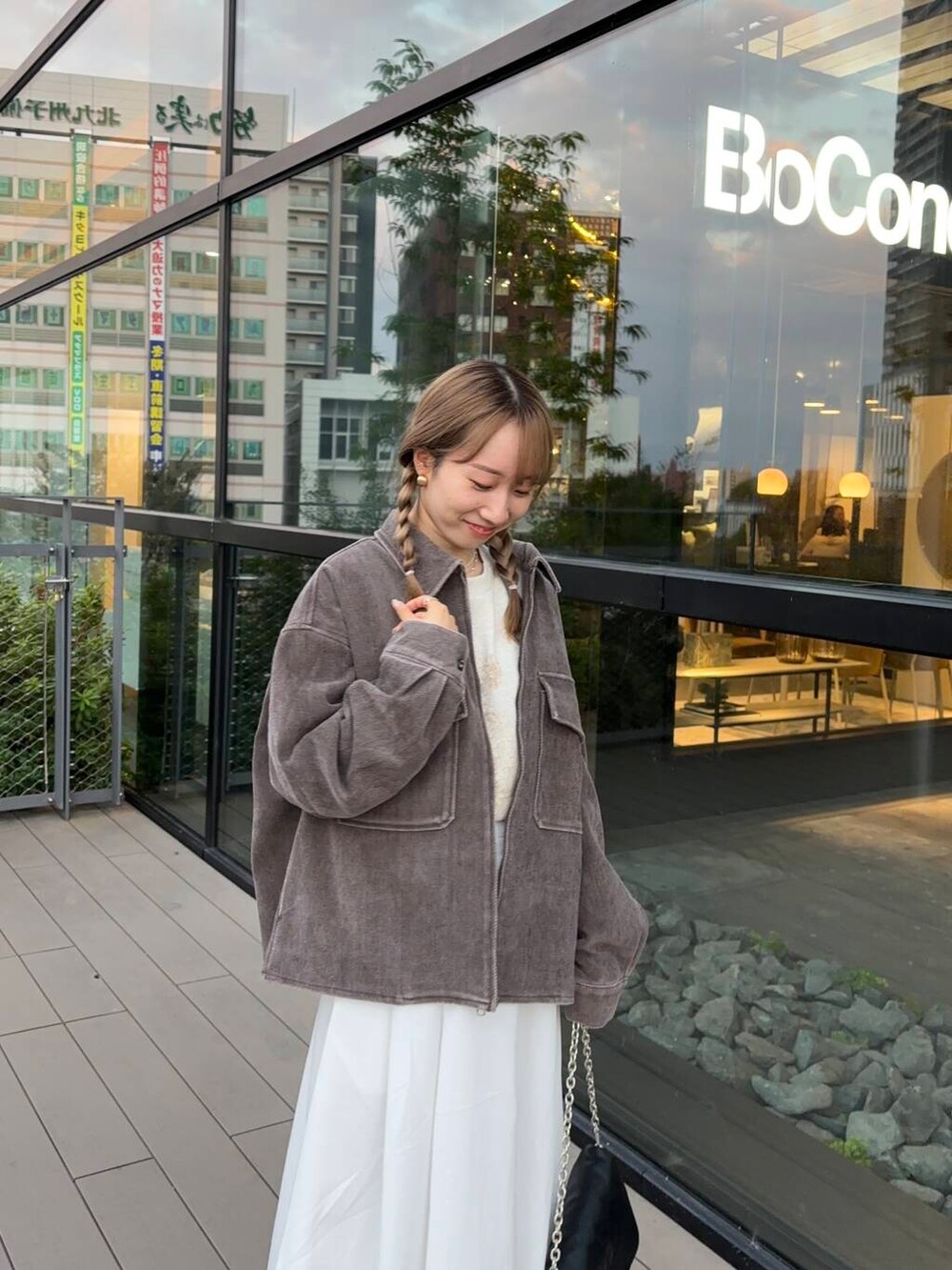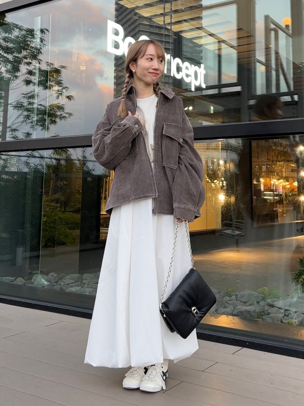 ユニセックスで着ていただけるスウェットとブルゾンを着用し、バルーンスカートと合わせて