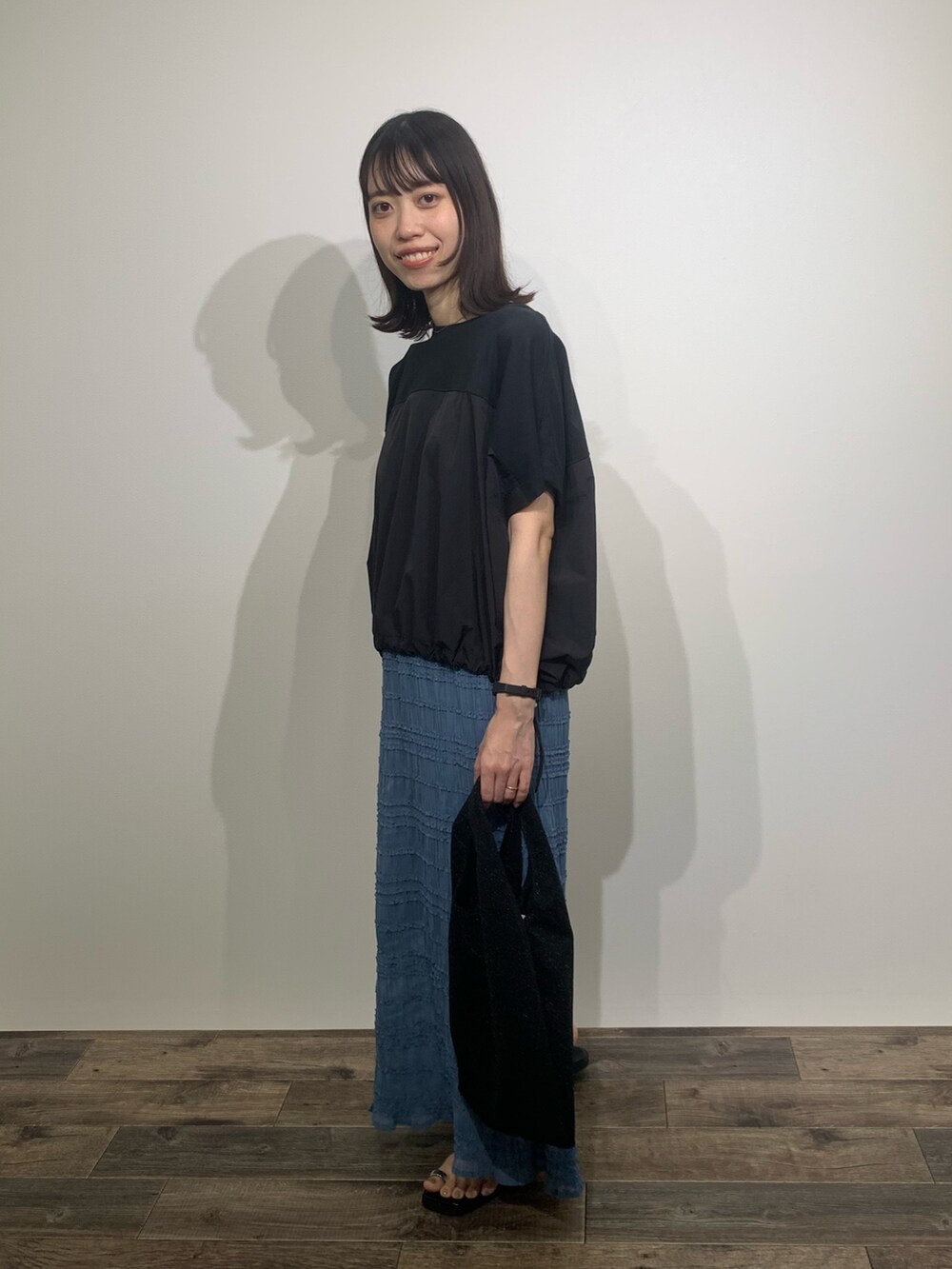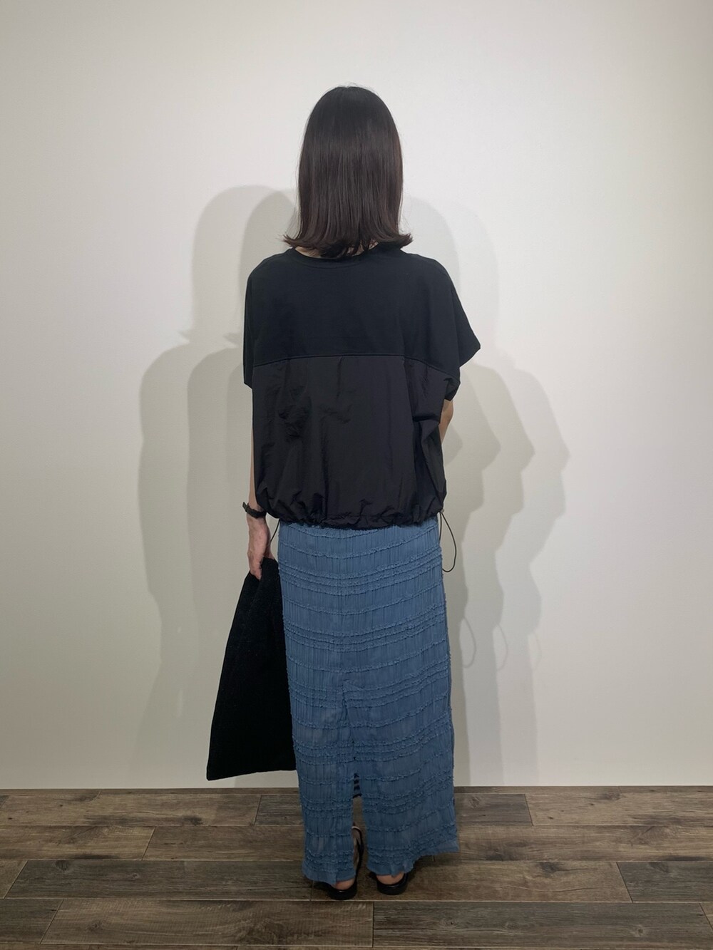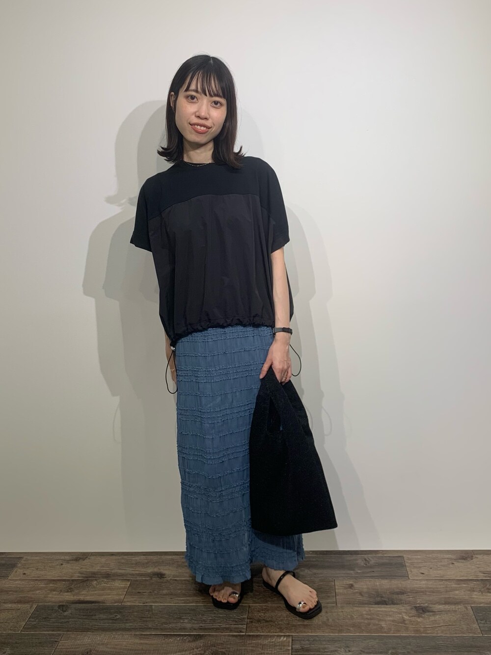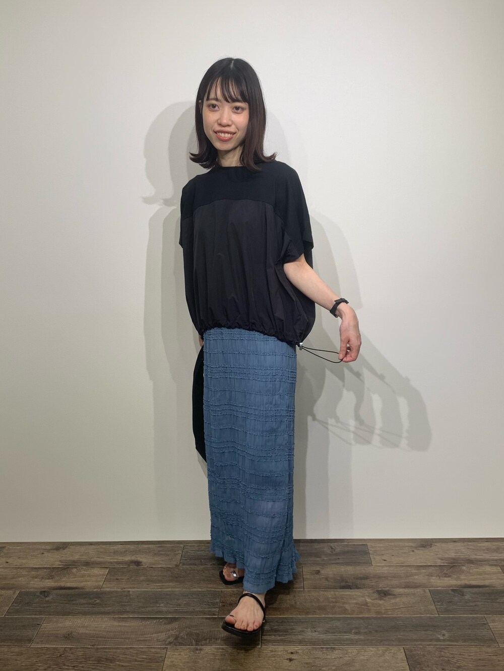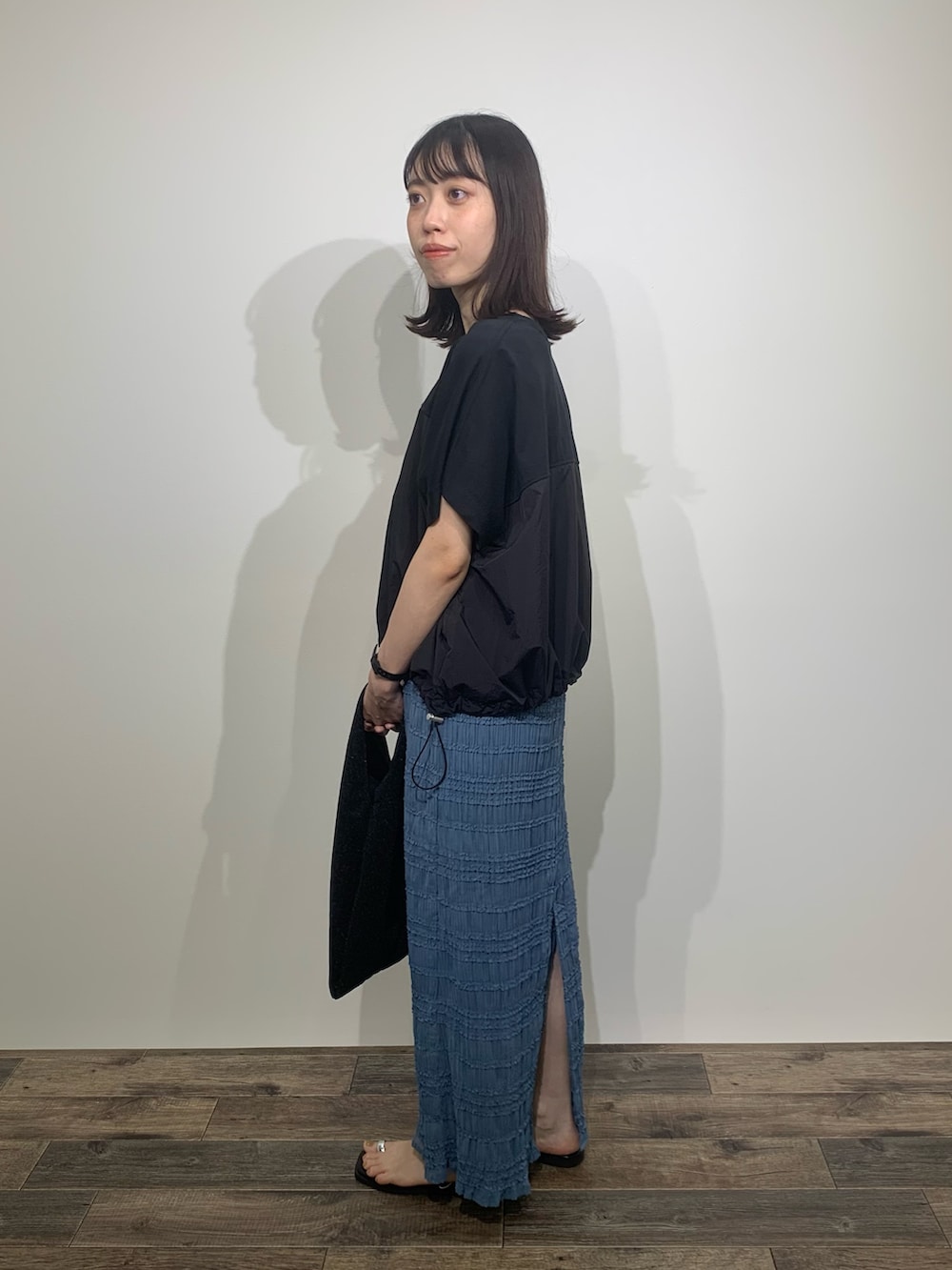 こちらのスカートは少し長めなので、今回のようにトップスをアウトで着る時はウエスト部分を1度折り返して履いています◯