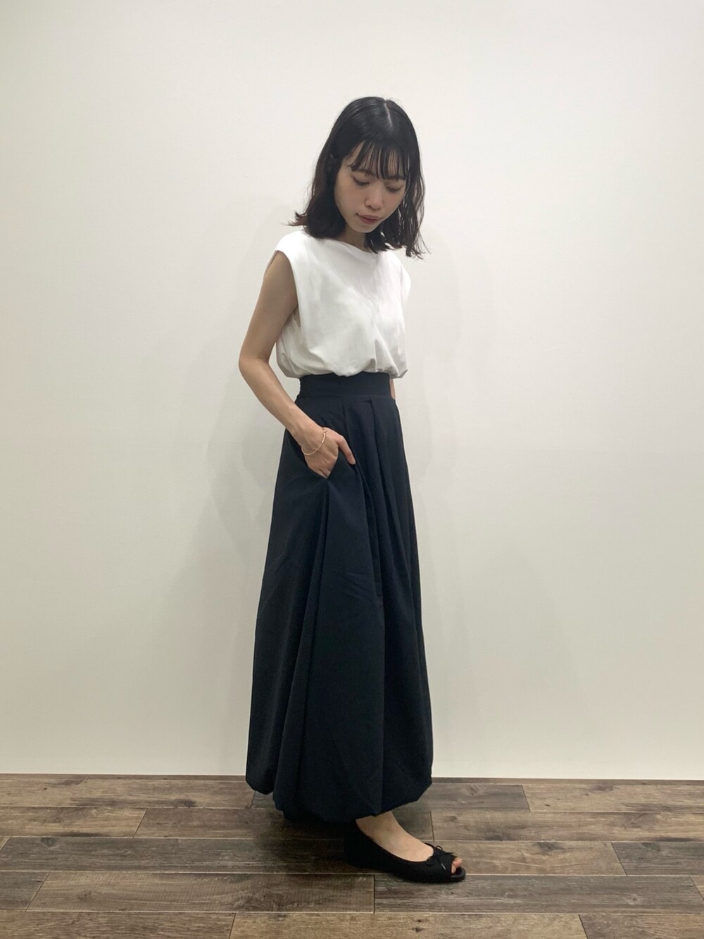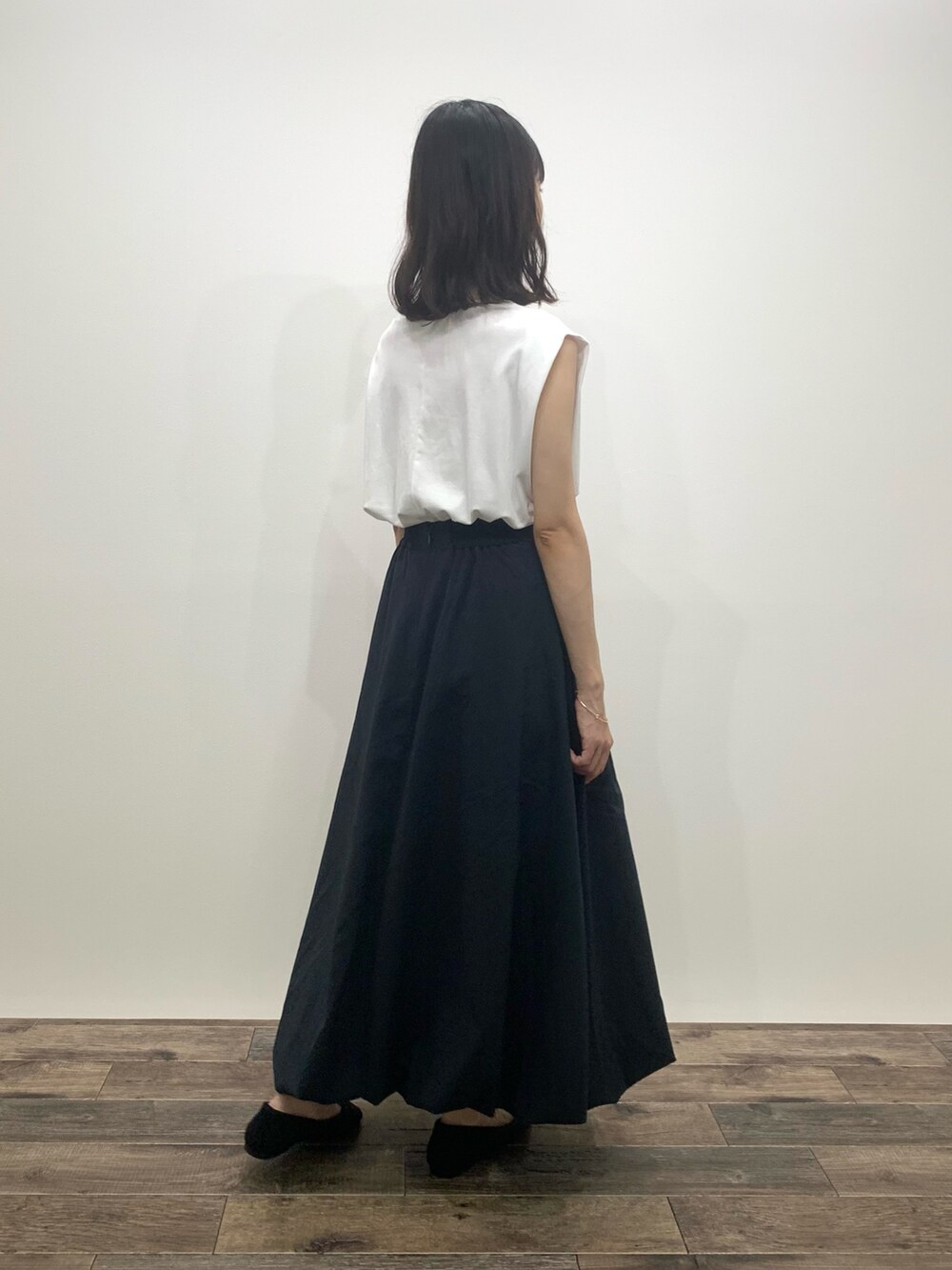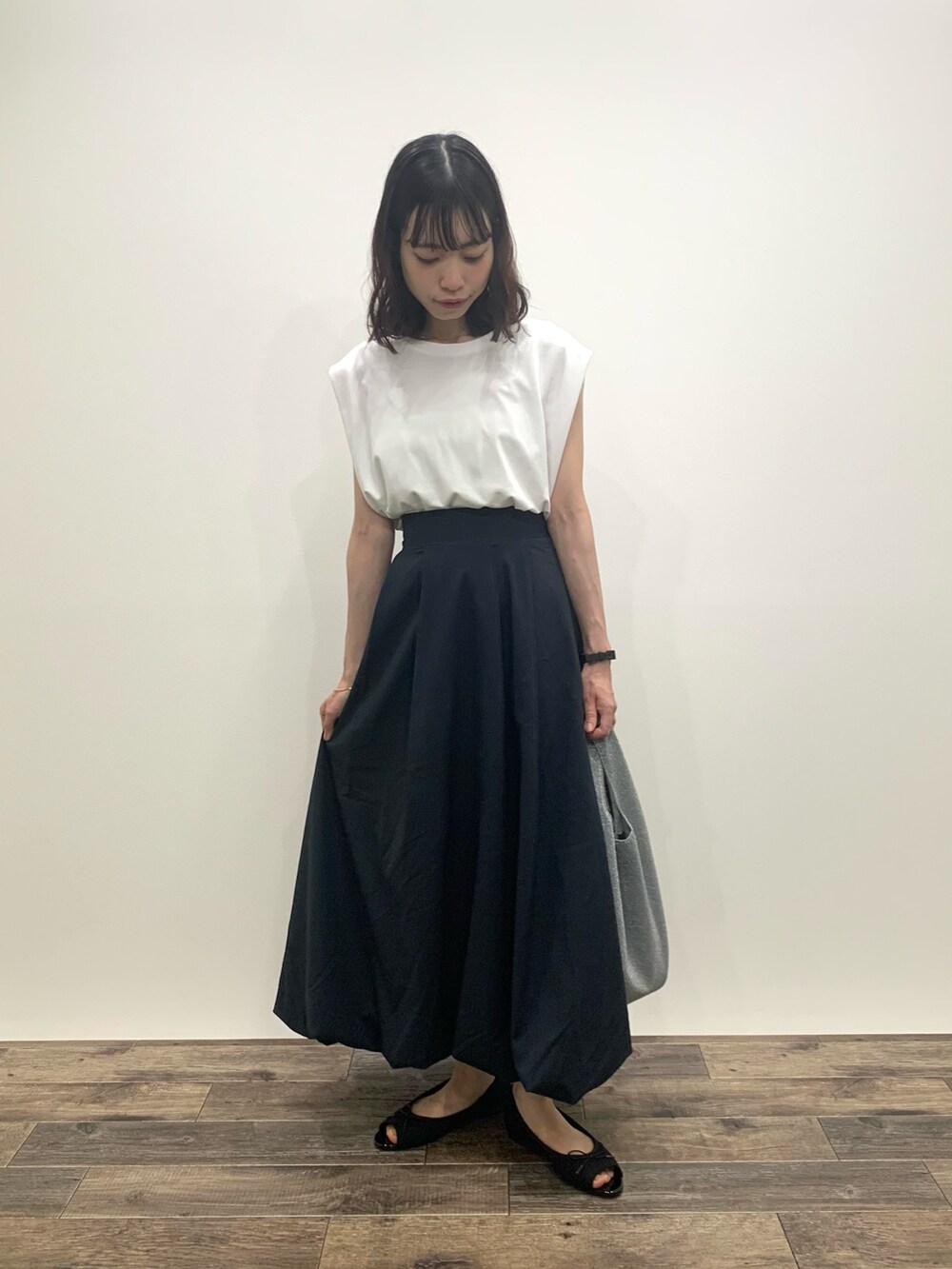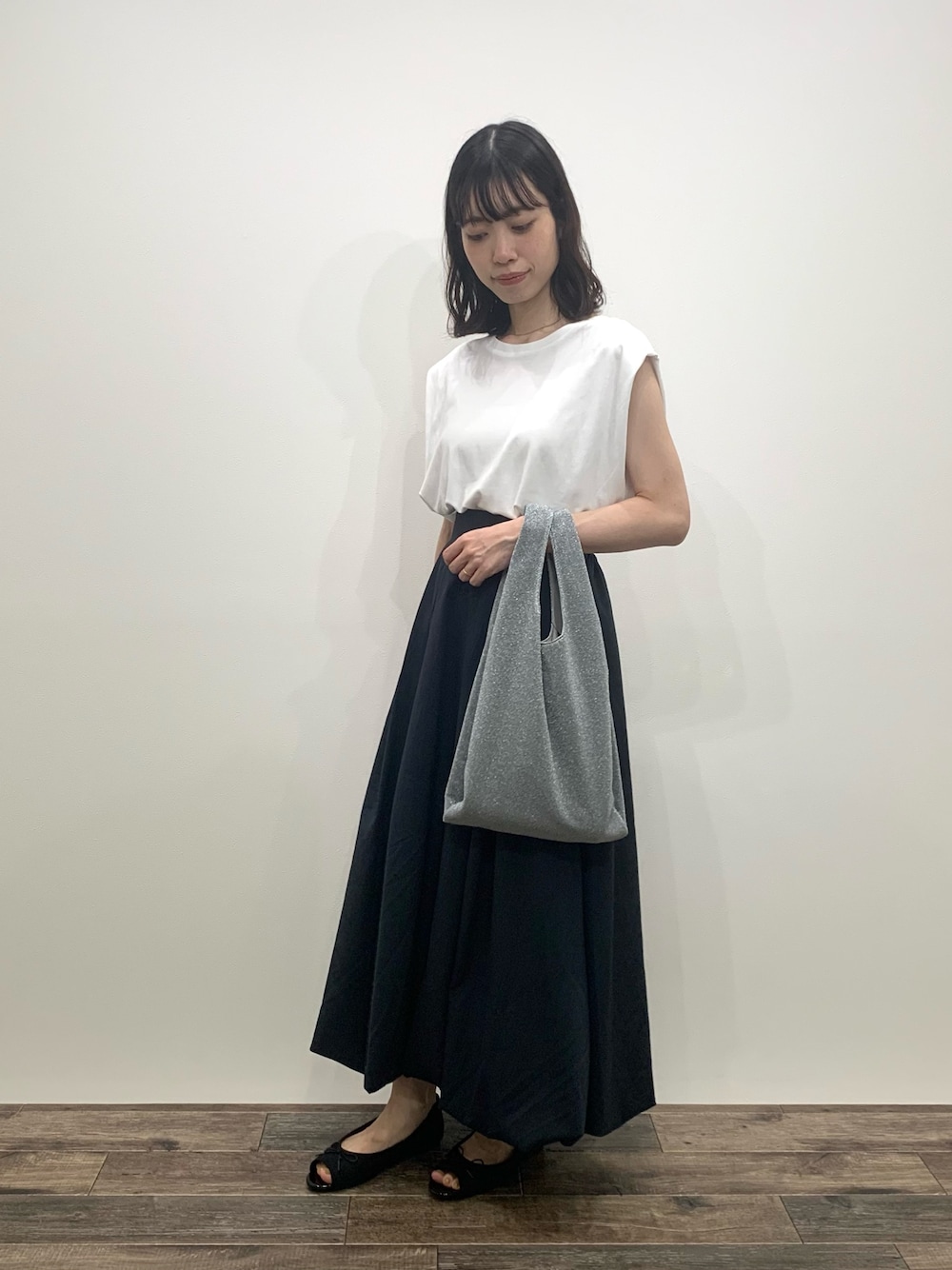 全体的にモノトーンでまとめましたが、スカートをネイビーにすることで重くない印象になったかなと思います!