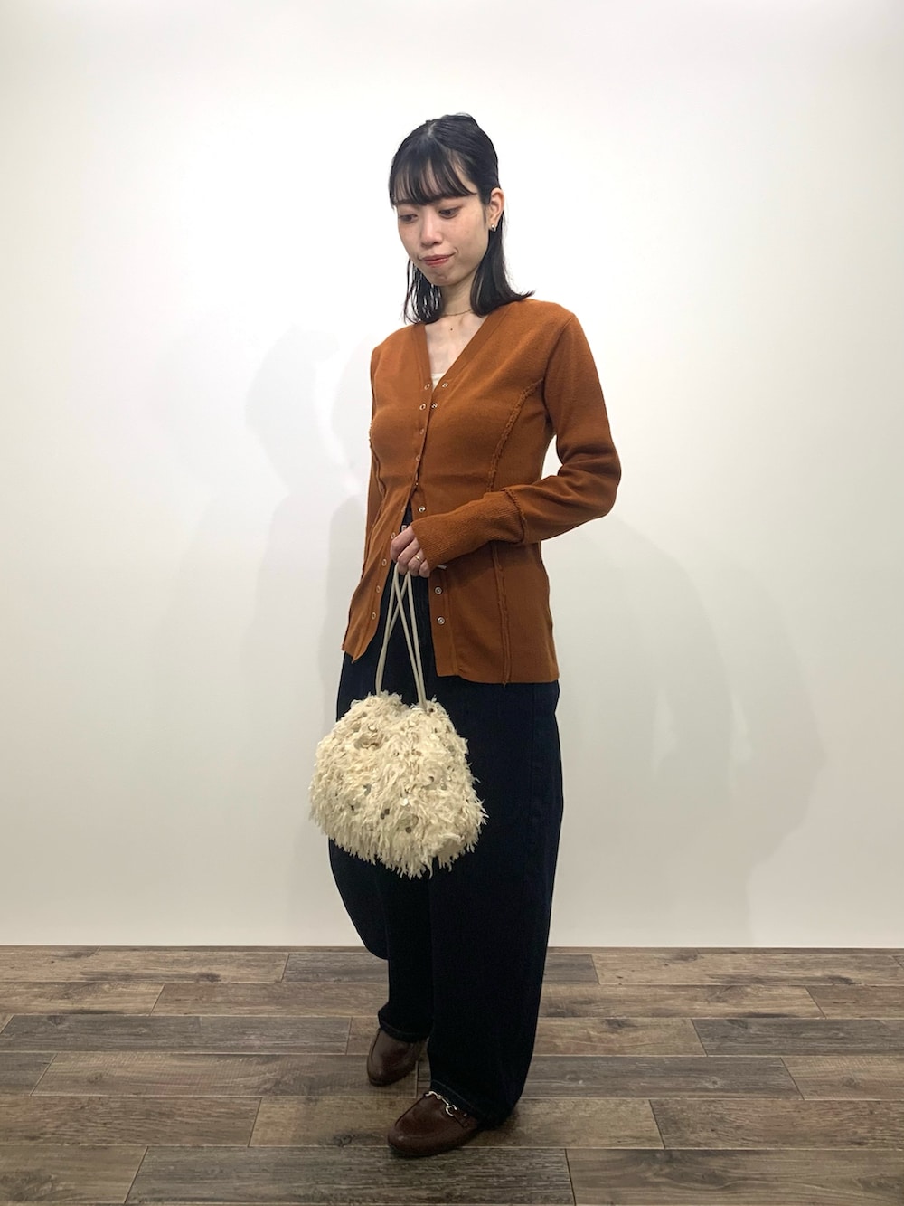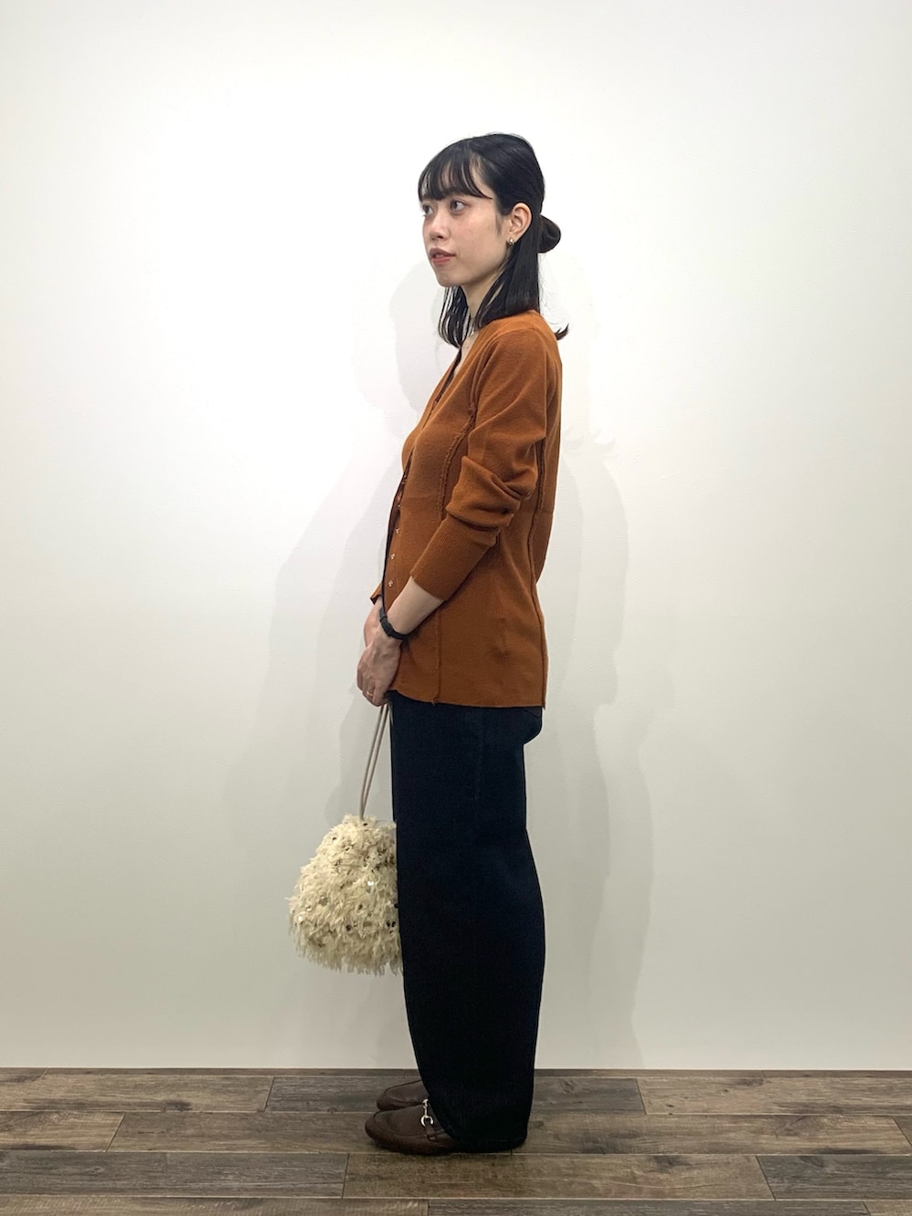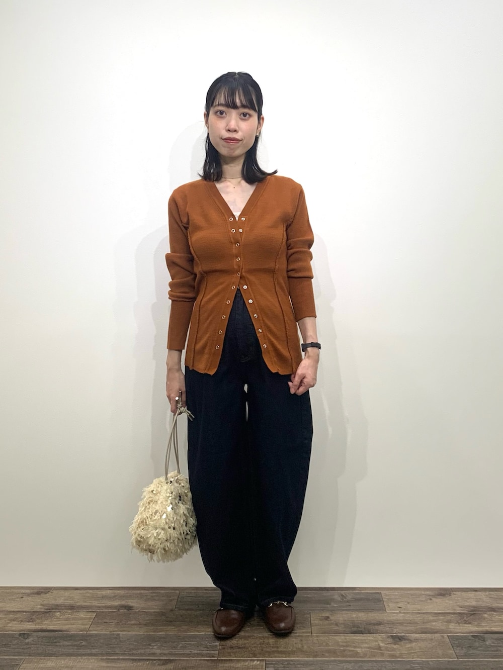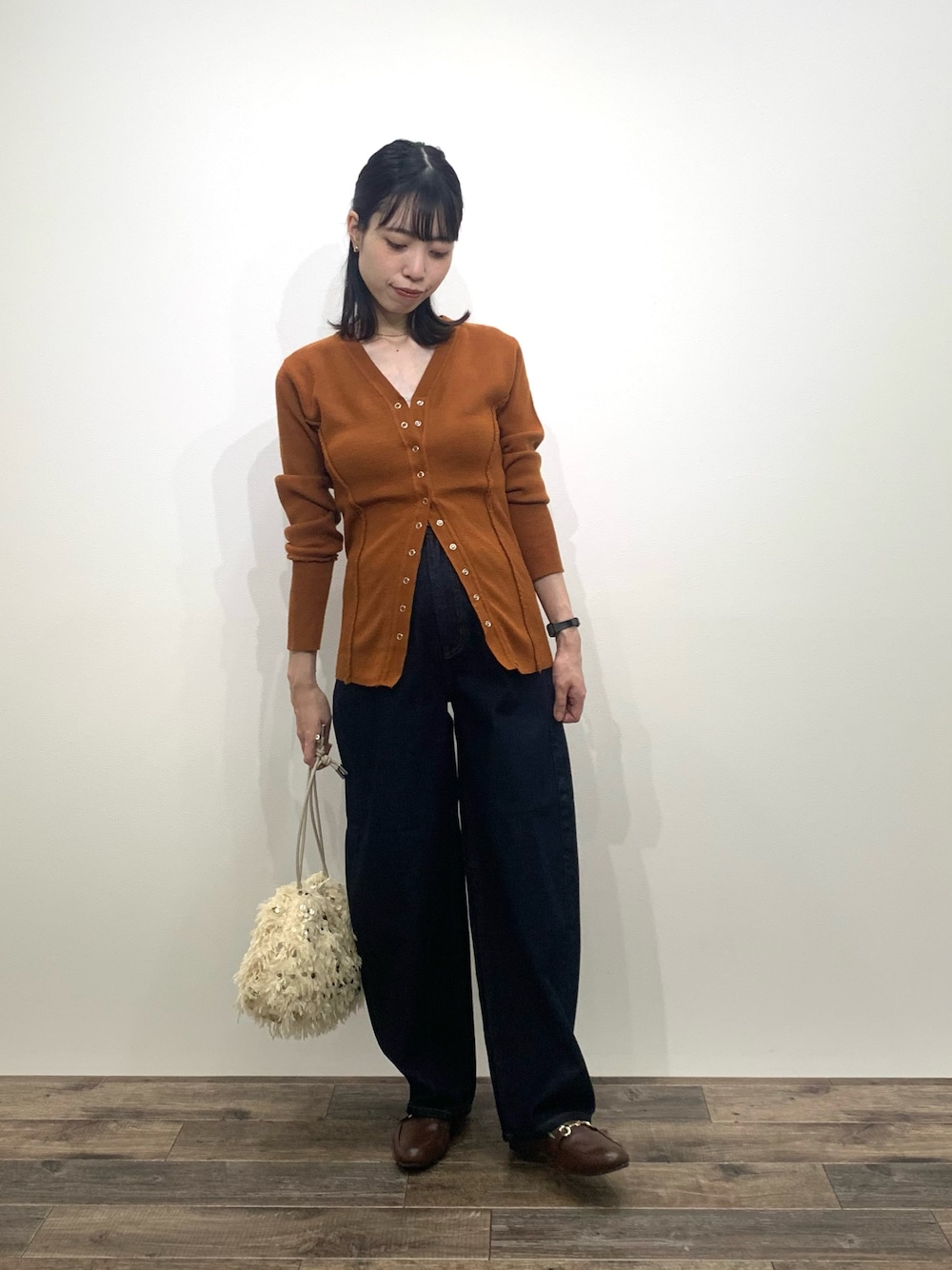 今回のようにボリュームがあるボトムスと合わせる際はスナップボタンを下から数個開けて着用するのがおすすめです!