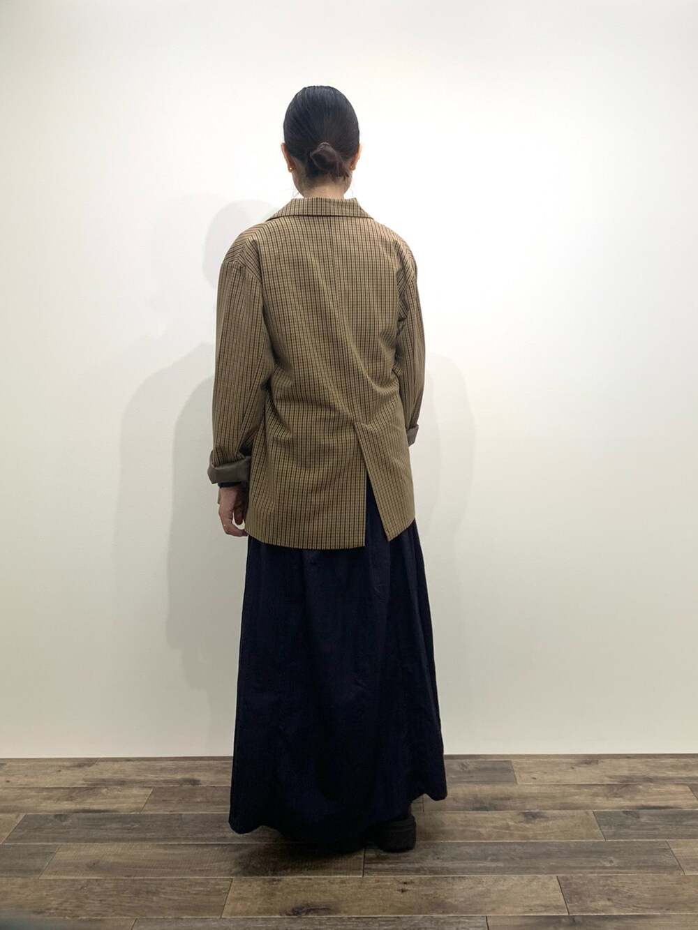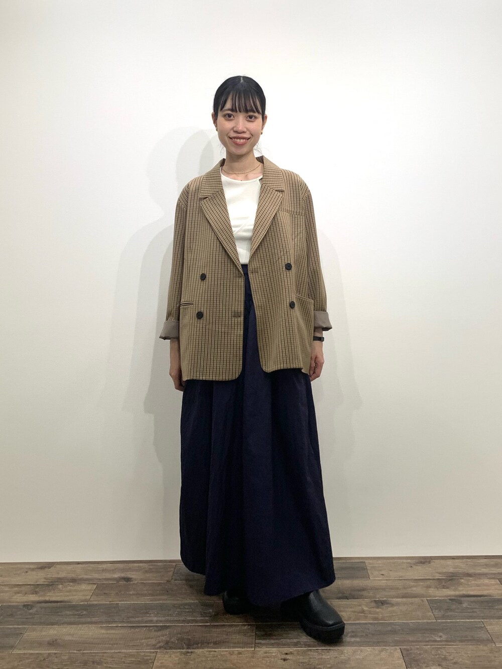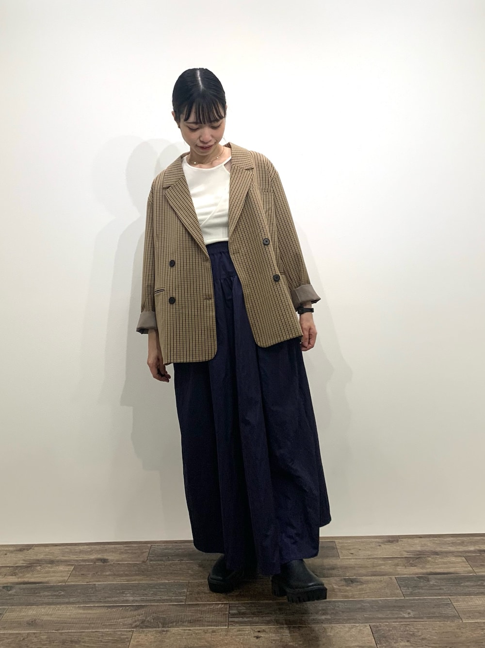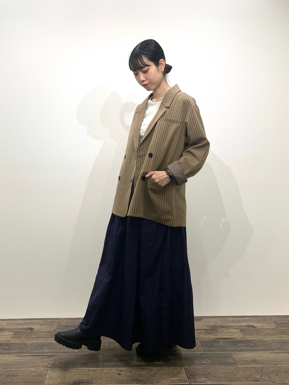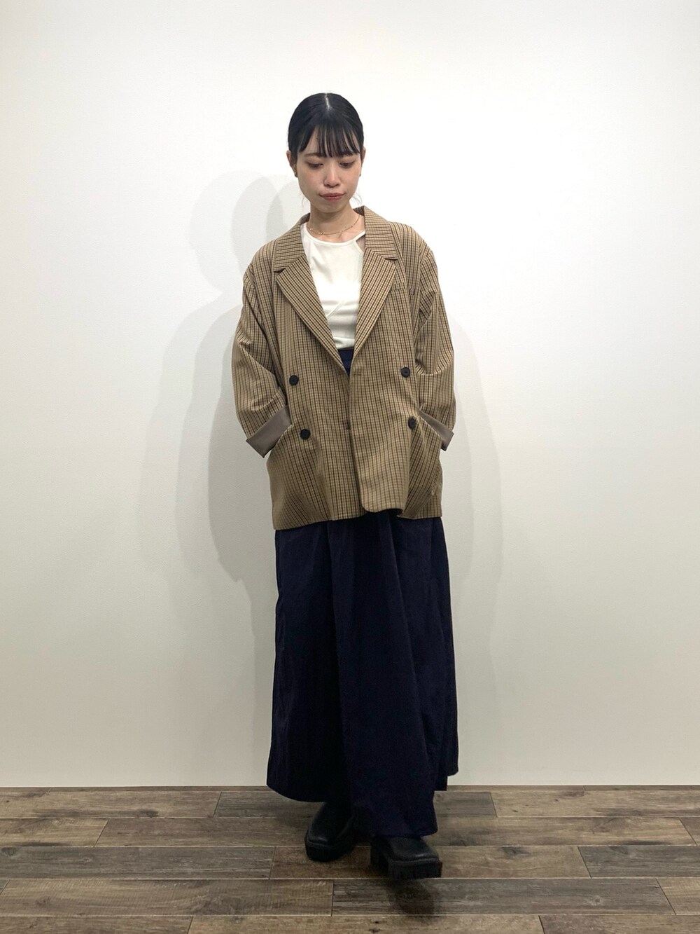 スカートはシャカシャカした軽い素材でできていて、155cmだと少し丈感長く感じたので、厚底のものやブーツを合わせるのがおすすめです🫶🏻