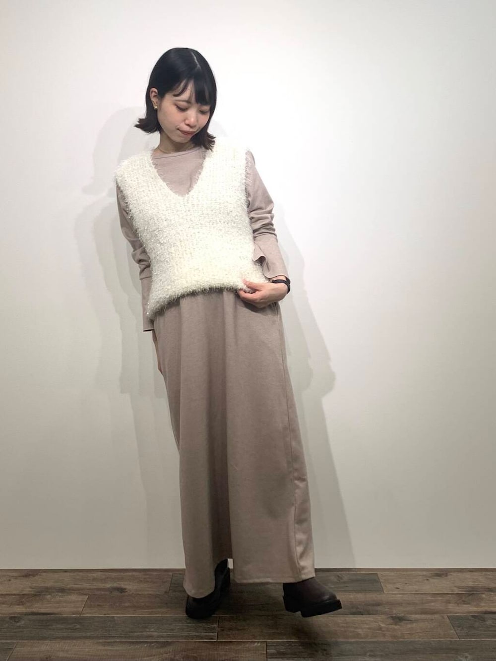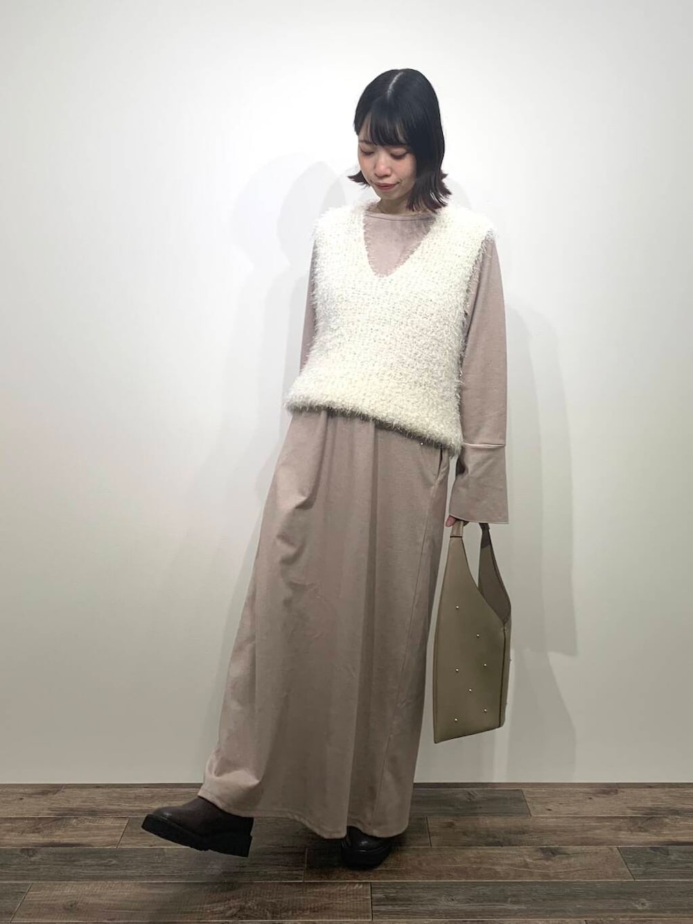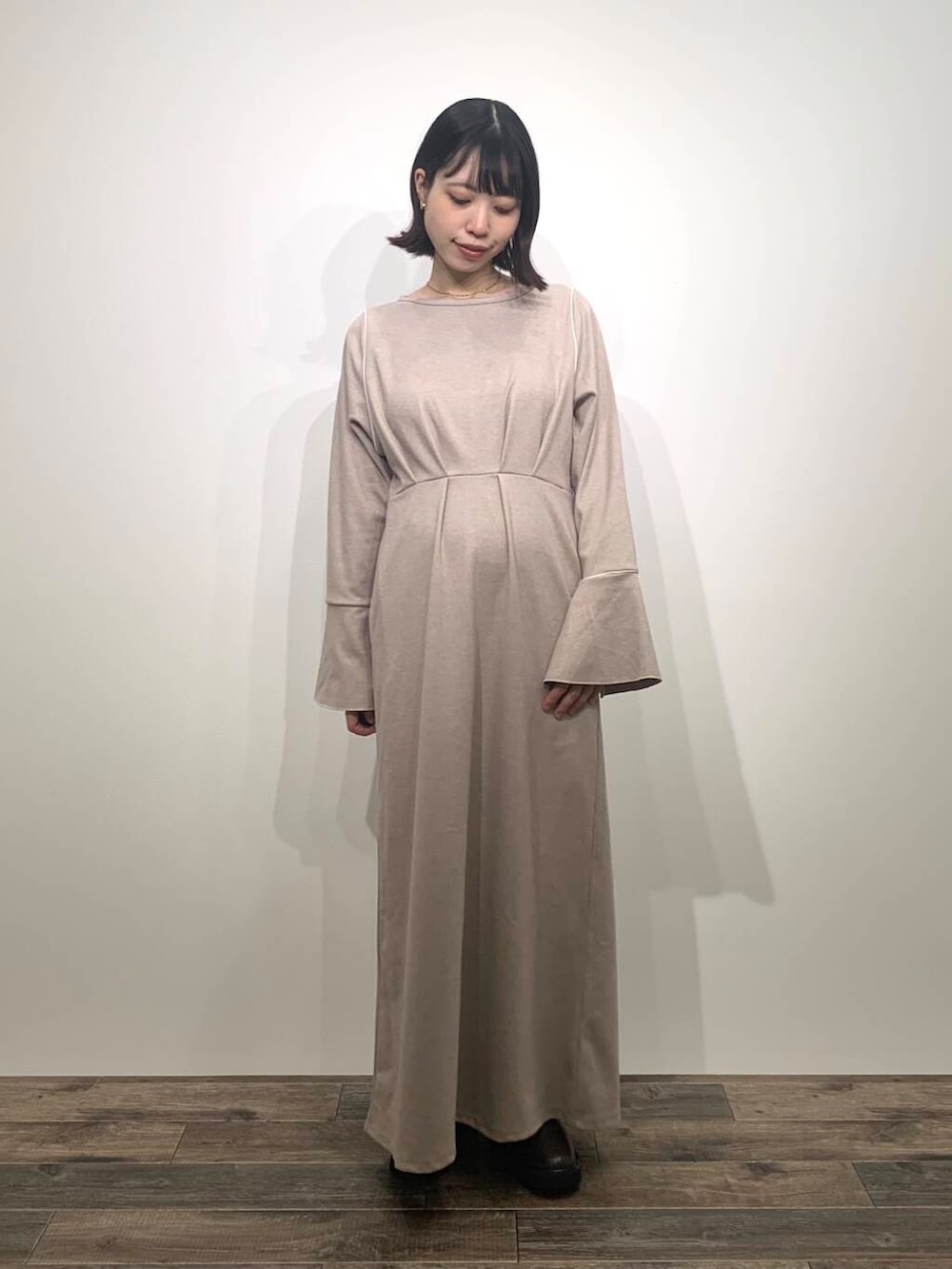 フェルトのような温かな素材のシンプルなワンピースですが、パイピングや袖がフレアのデザインがポイントになっていて1枚で着ても重ね着しても可愛いです◯