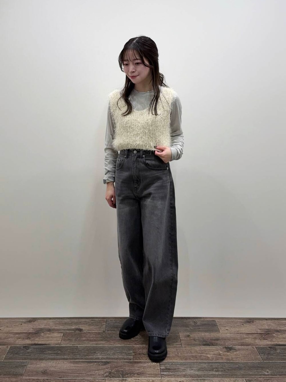 ベストは短丈なのでハイウエストのボトムと相性いいです◎