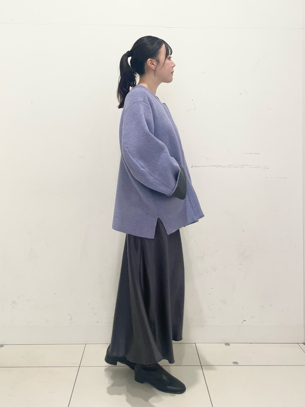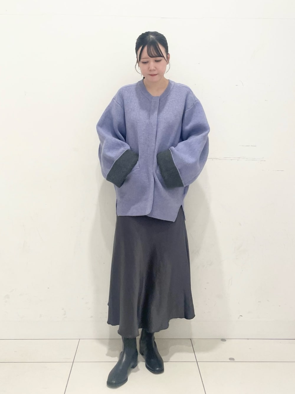 バイカラーニットコートを着用してます