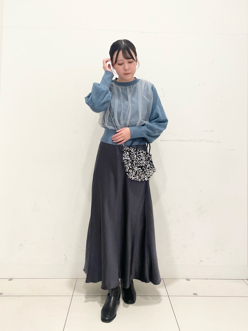 トップスのチュールレイヤードセーターがとても上品で女性らしさを演出してくれるのでおすすめです✨️