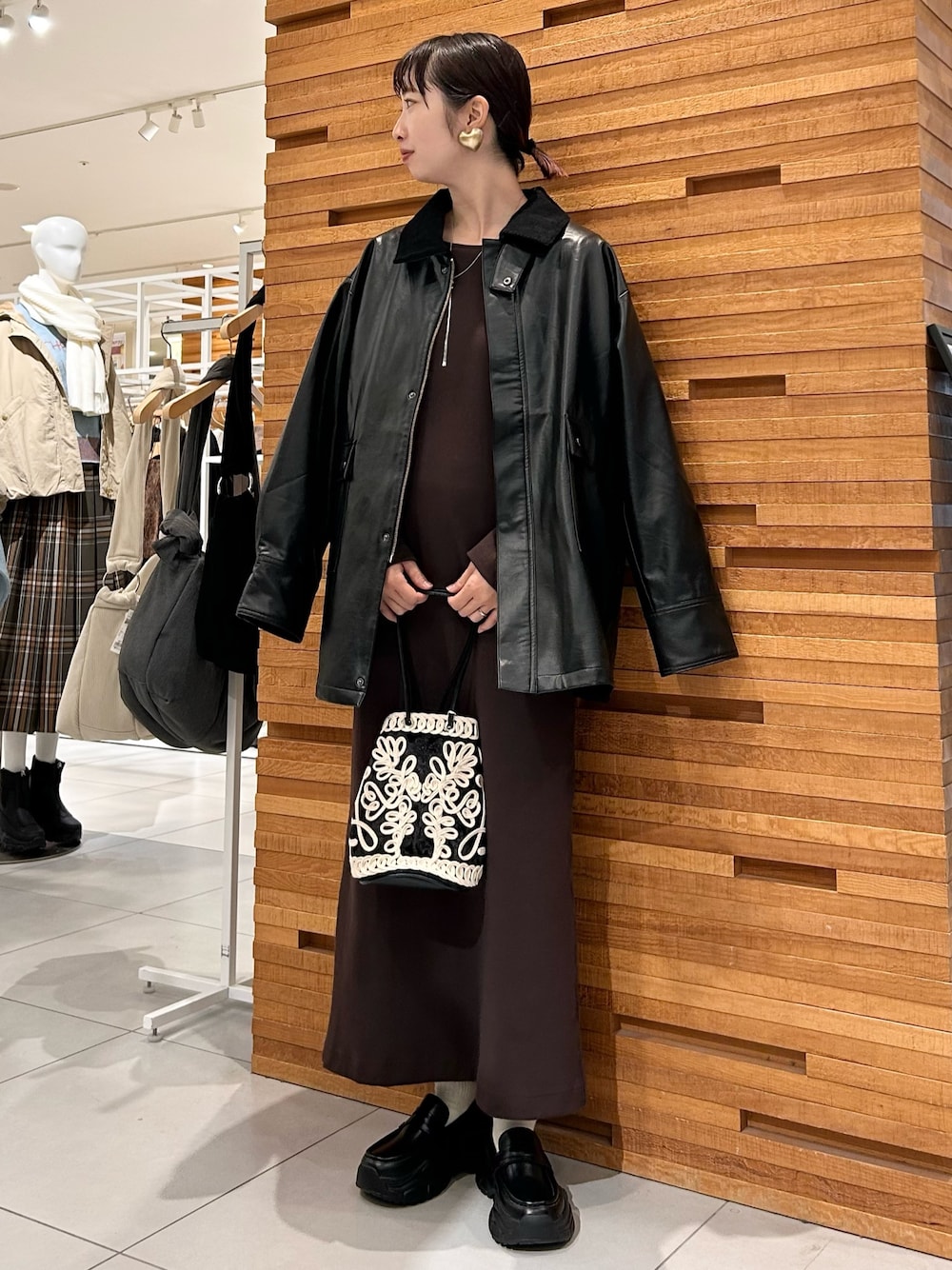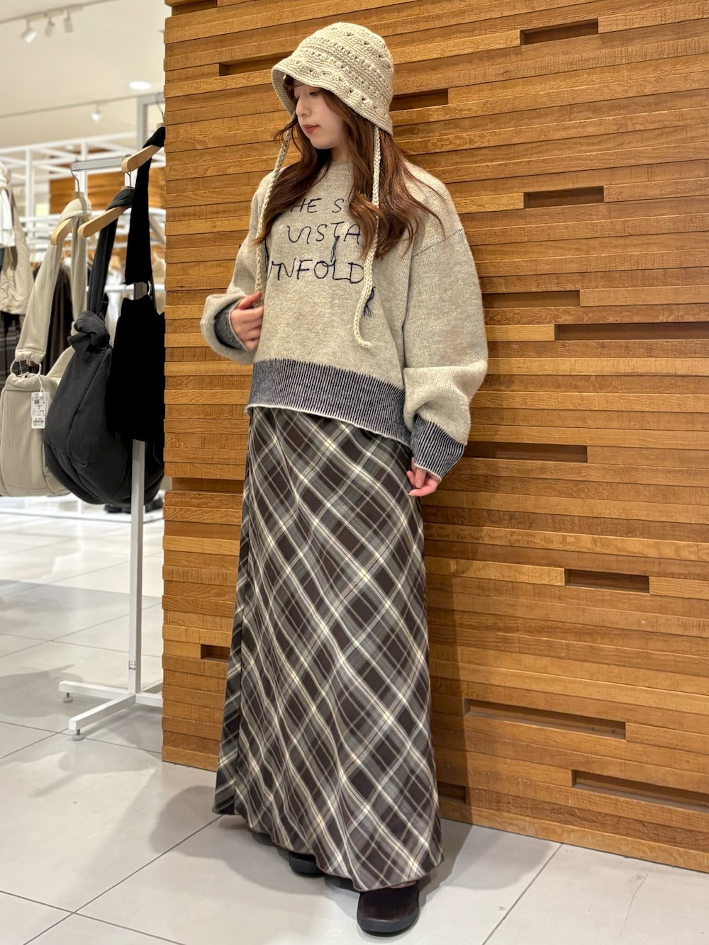 落ち着いた色味なのでドット柄のサテンスカートで合わせてみました♪
