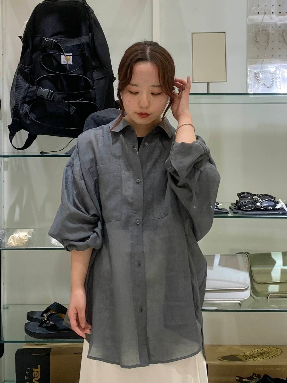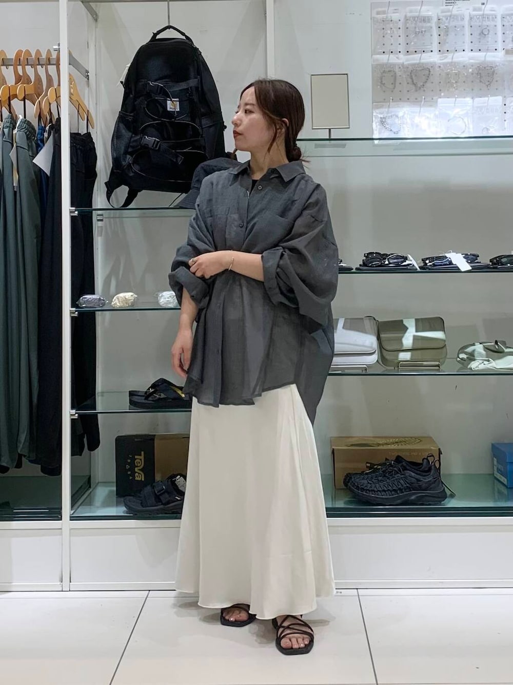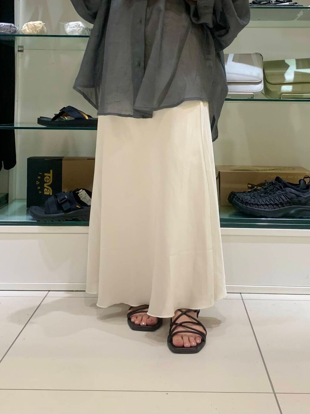 透け感のあるシアーシャツはサテンスカートと合わせるとより大人っぽく仕上がります🤍