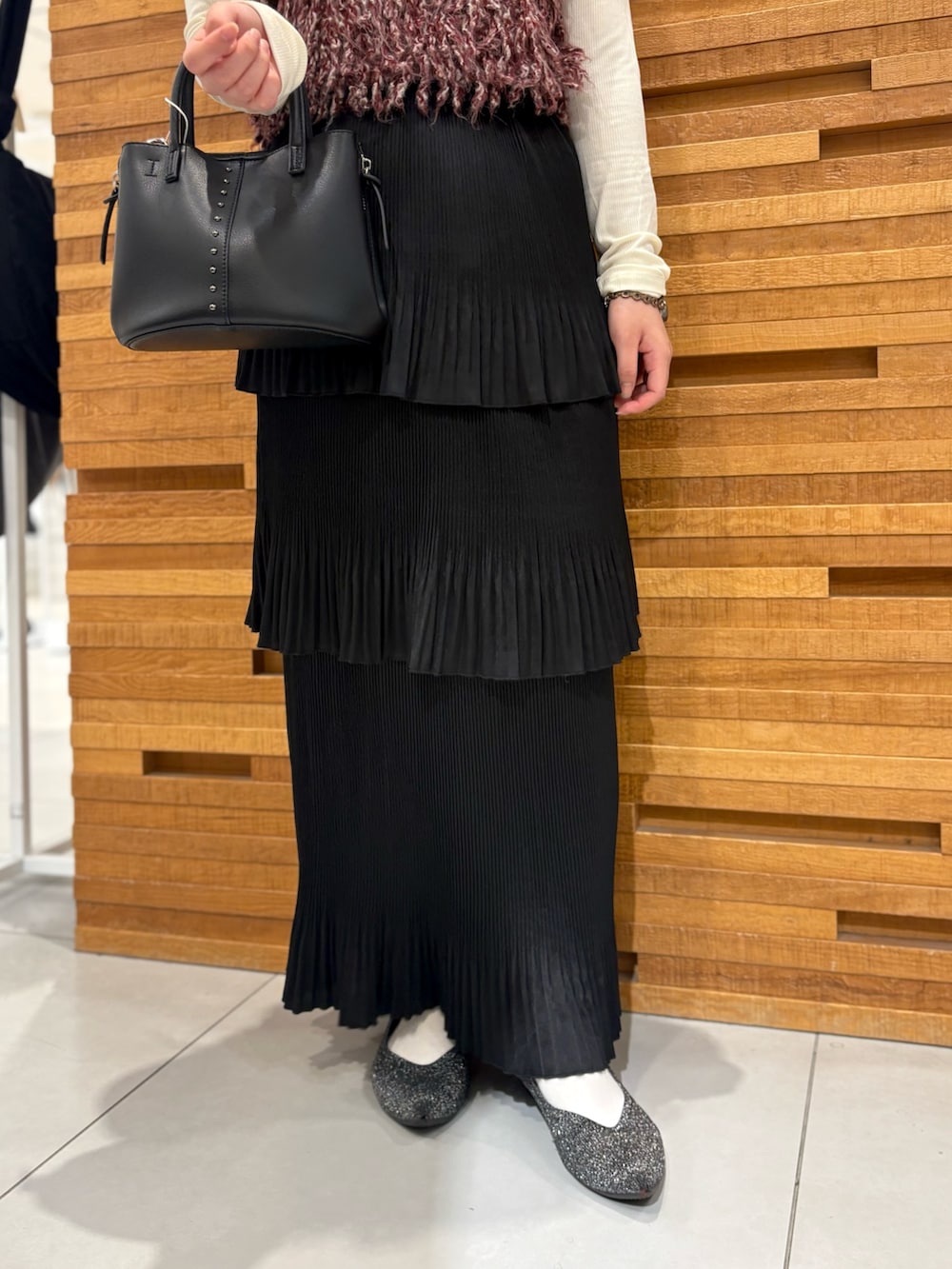 プリーツとティアードを掛け合わせたコーデのアクセントになるデザインが特徴的なスカートになっております🖤