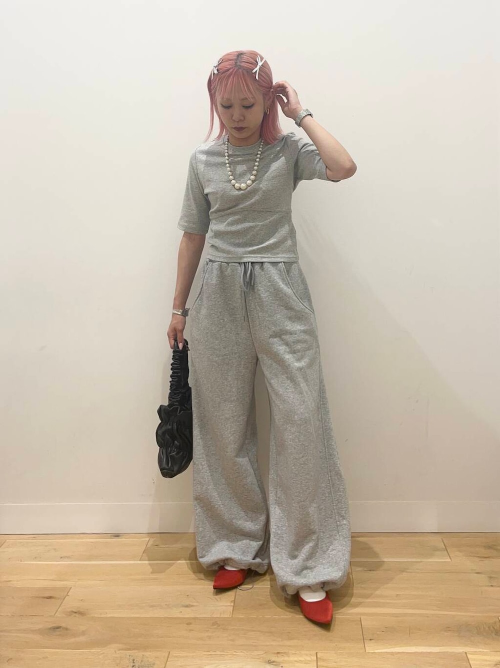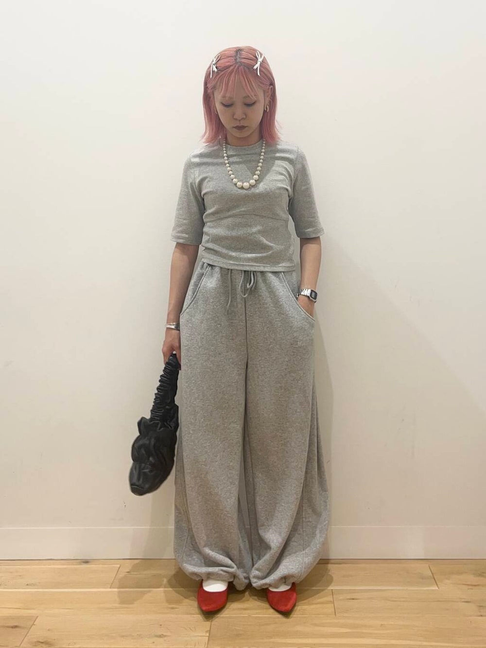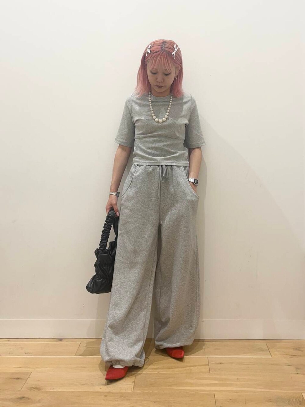 グレーのワントーンに赤の差し色が可愛いです❤️