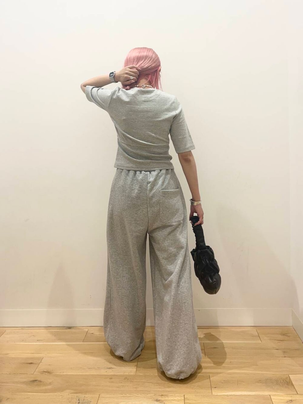 スウェットパンツはかなり太めなのでコンパクトなトップスのと合せでバランスが良く見えます✨