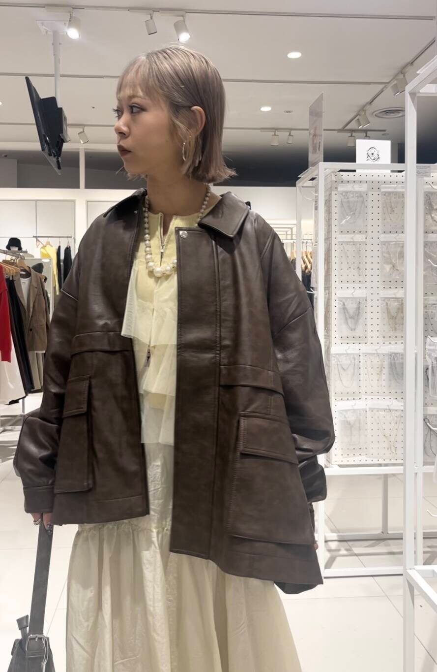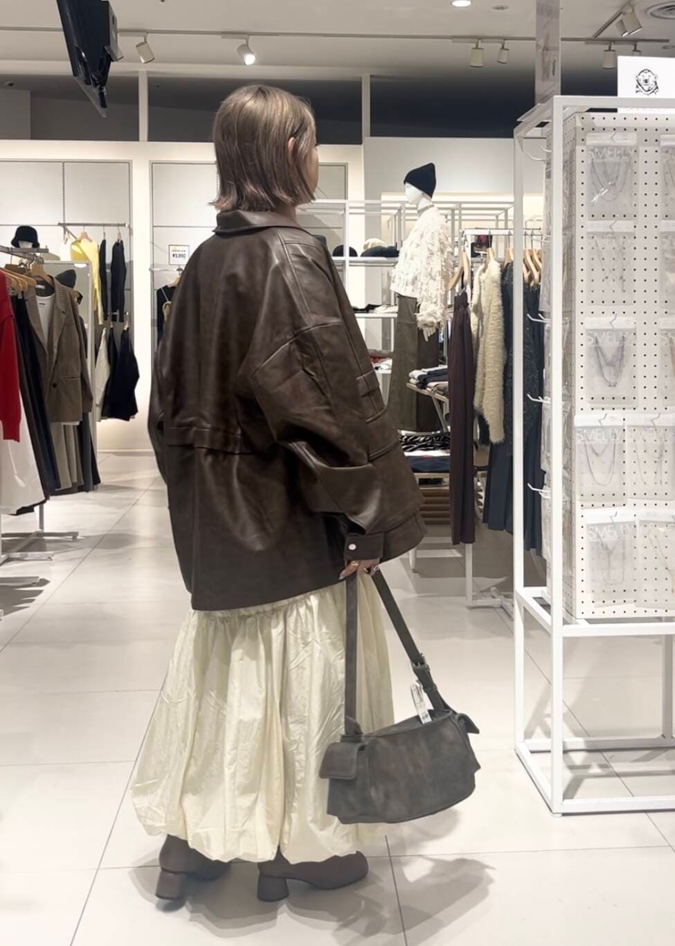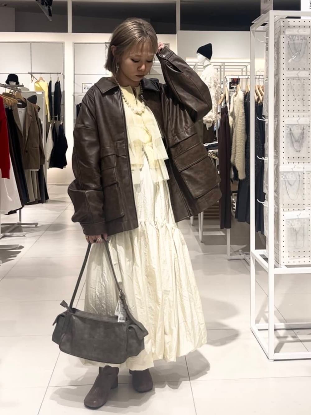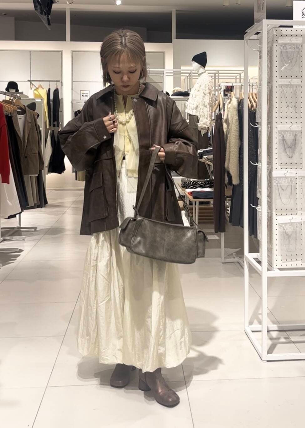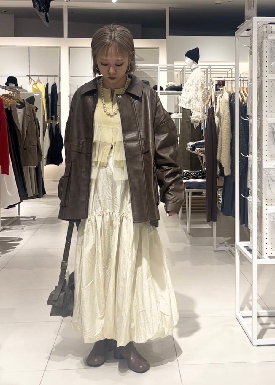 レザージャケットやヴィンテージっぽい靴やバッグには甘めのスカートやチュールドッキングのニットでバランス良く🙆🏼🤍🤍