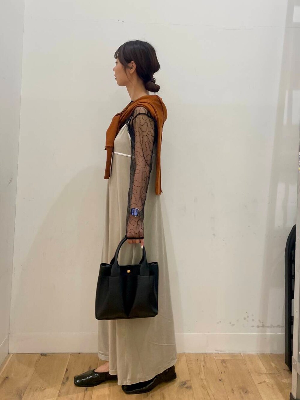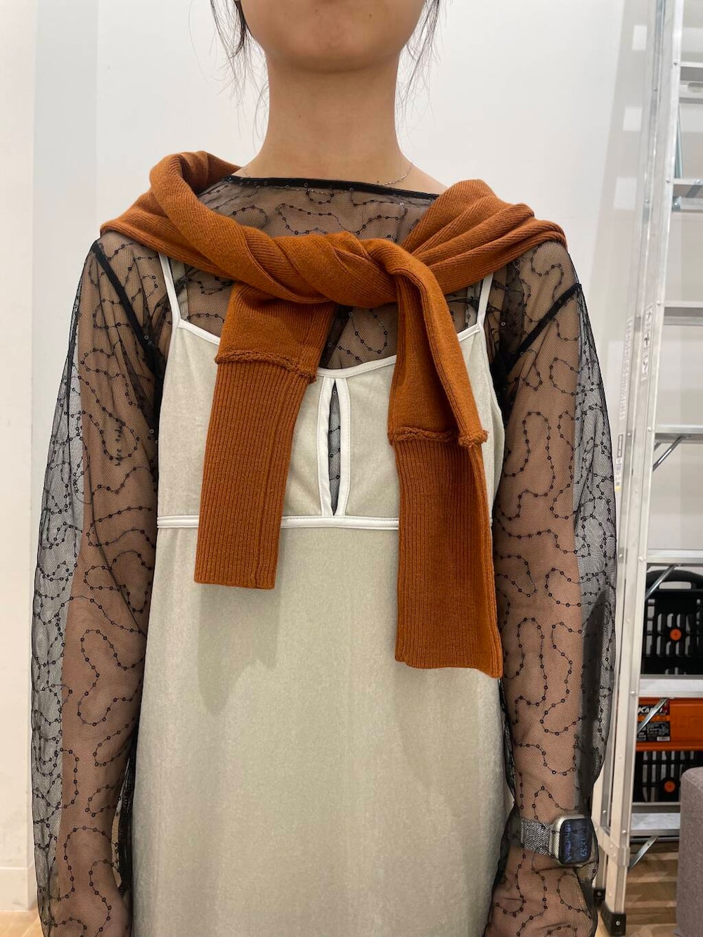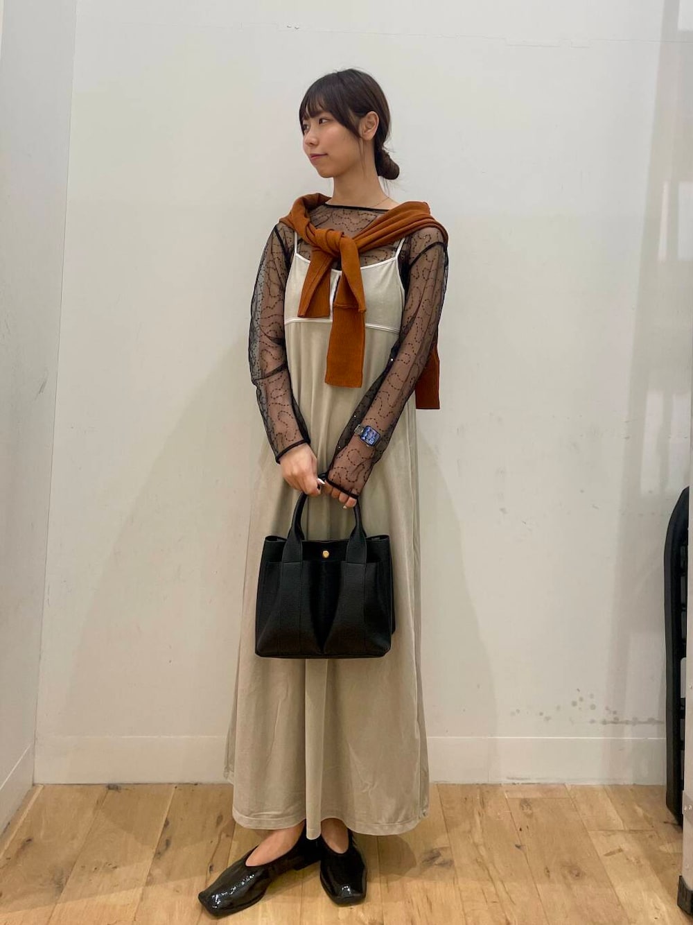 ベロアキャミワンピを使った秋先取りスタイルです。