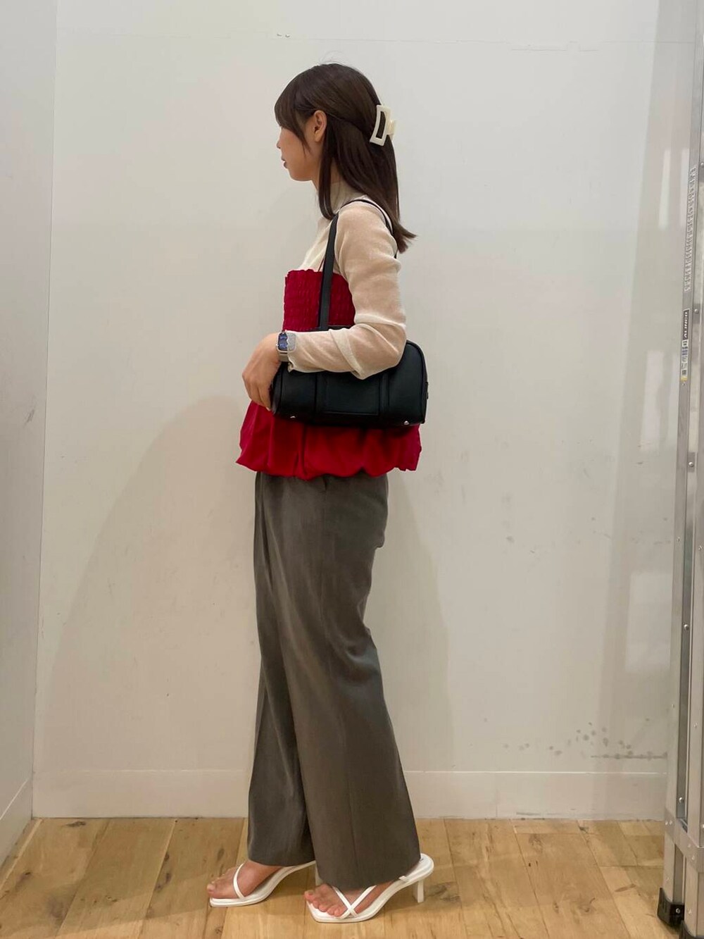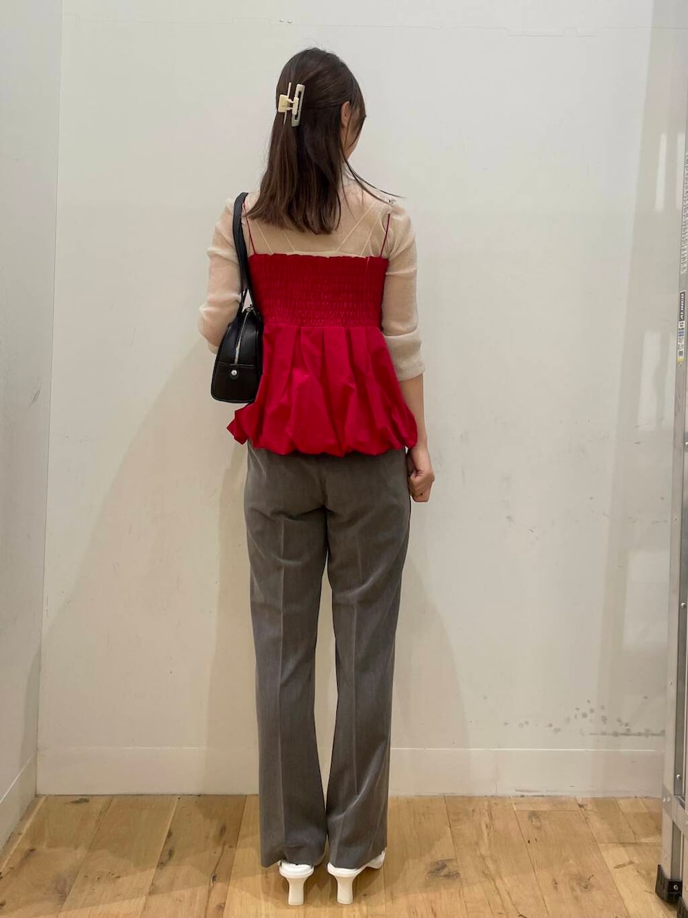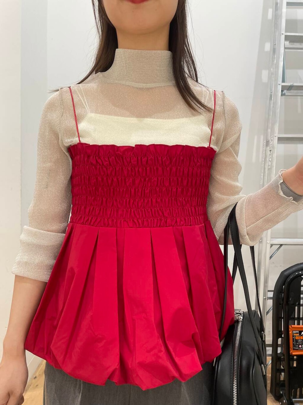 赤のバルーンビスチェが目を引くスタイリングです。