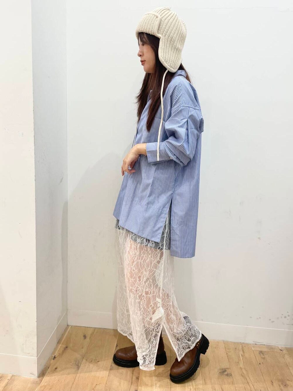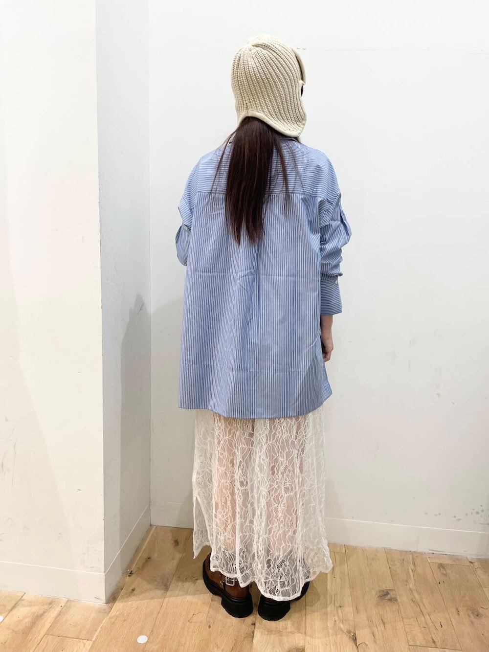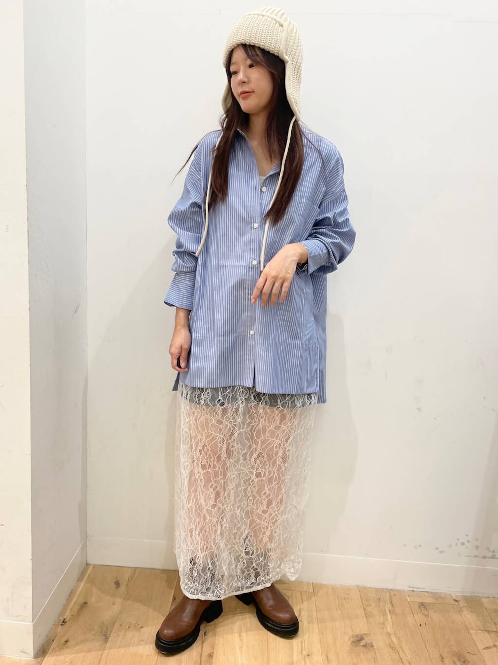 ストライプシャツがチュニック丈なので、