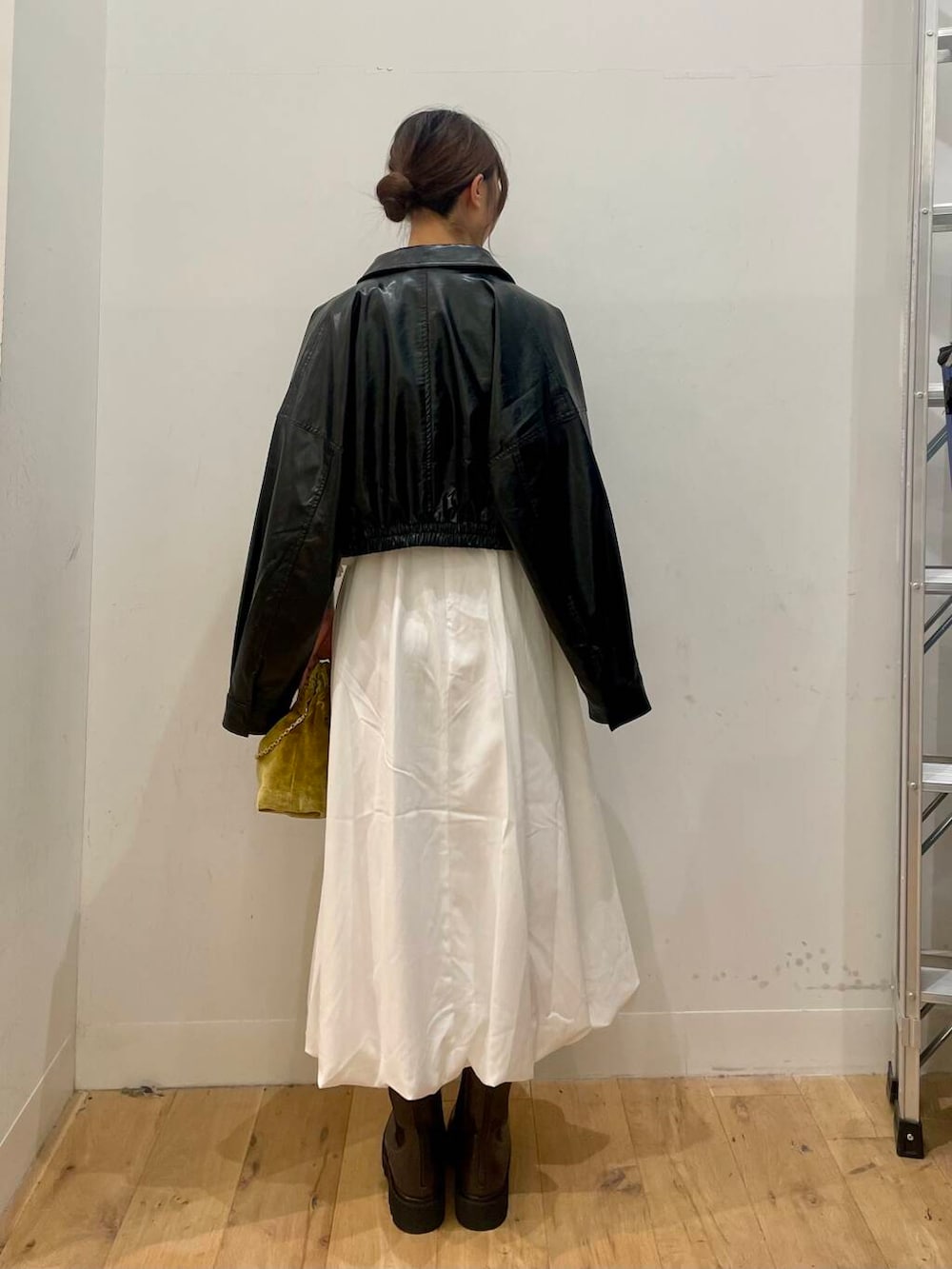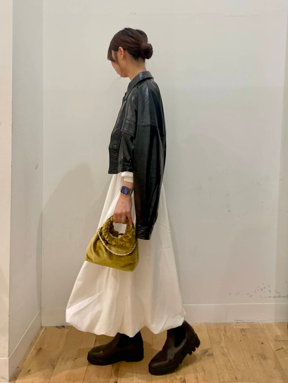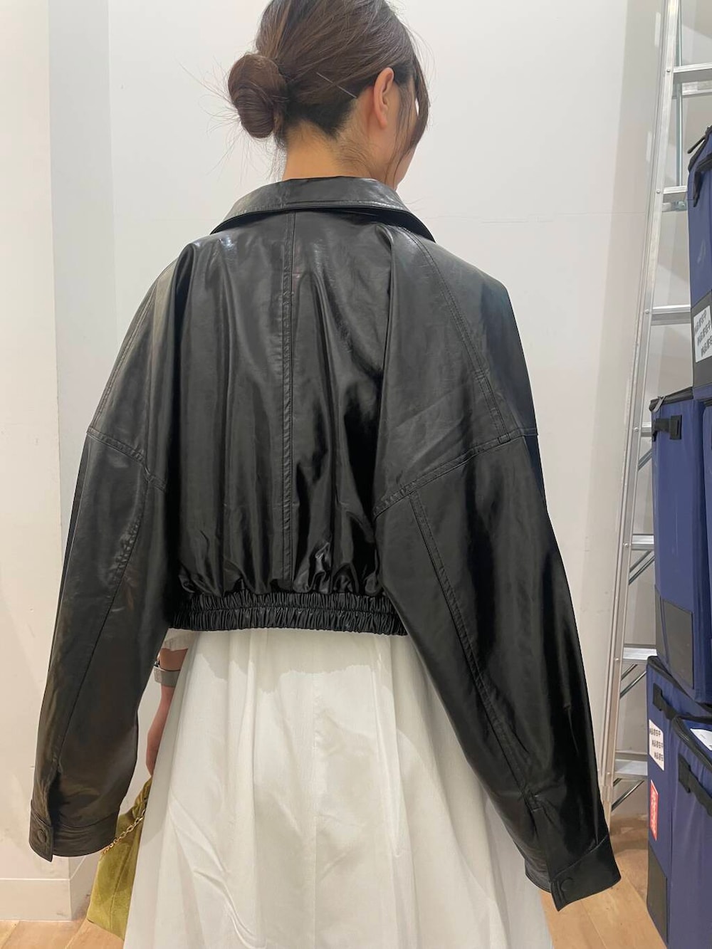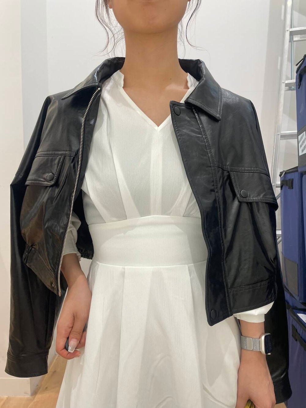 レザージャケットは丈が短くワンピースなどとも相性抜群◎