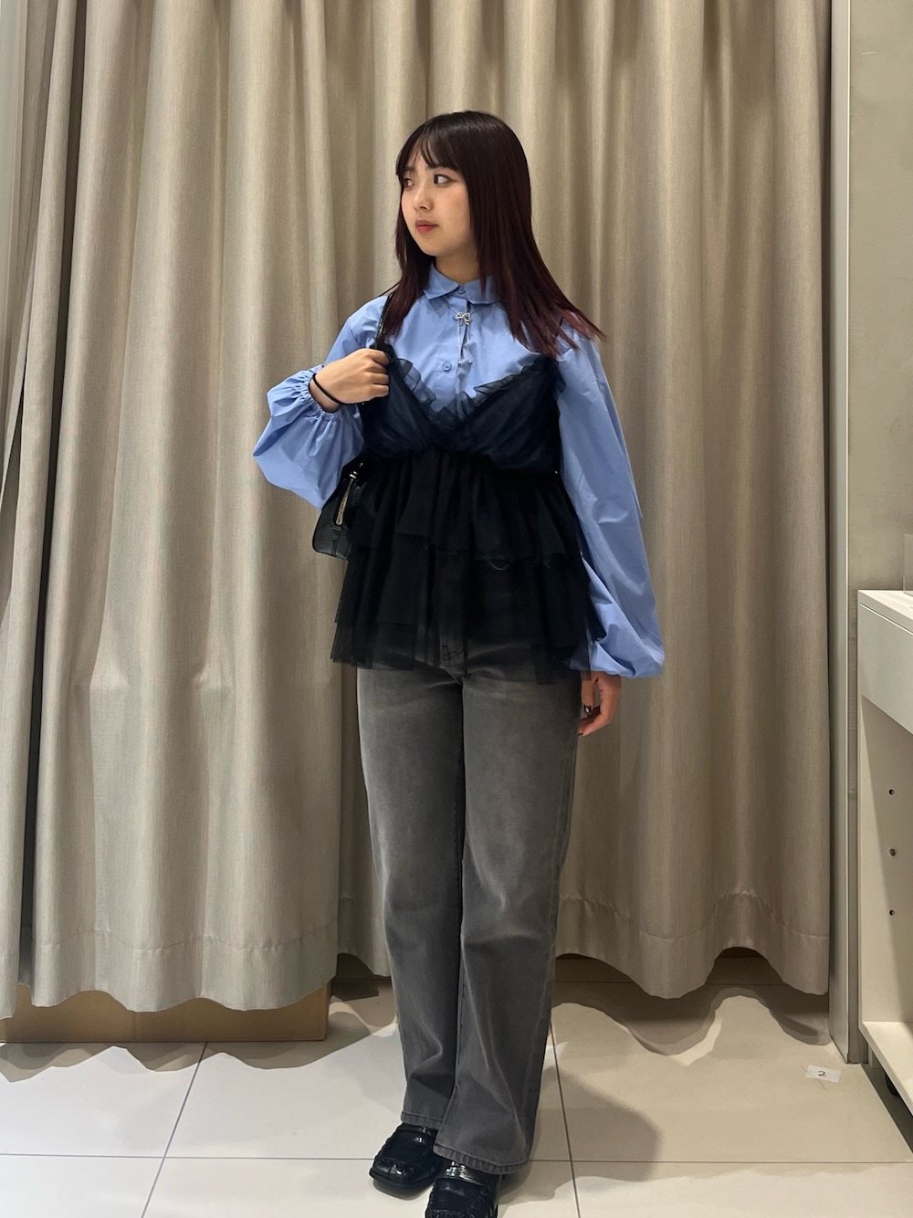 秋コーデです!ブラウスが青いので大人っぽく、チュールでかわいくなります!