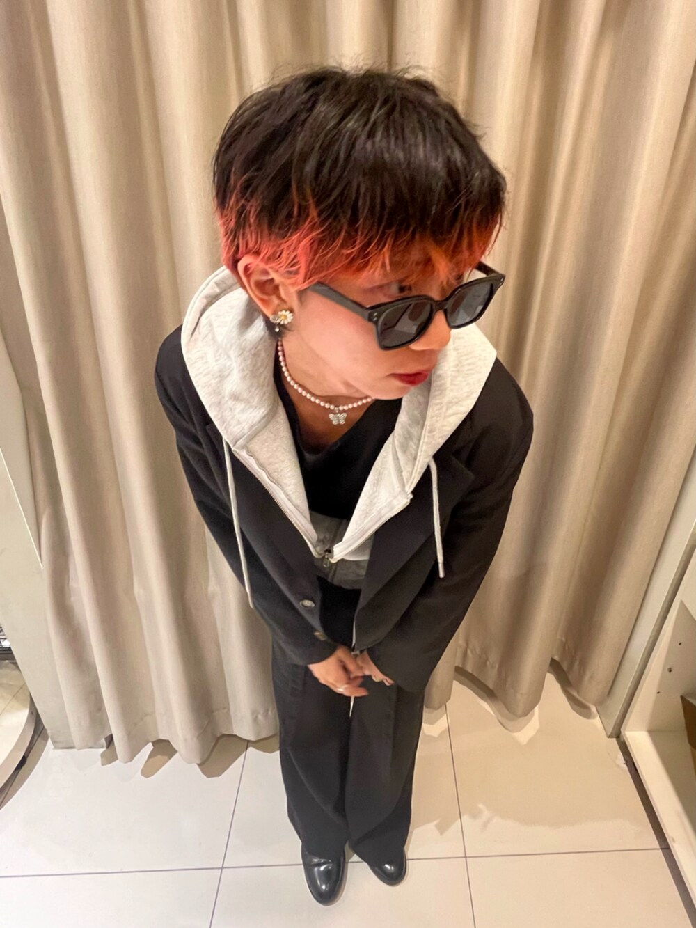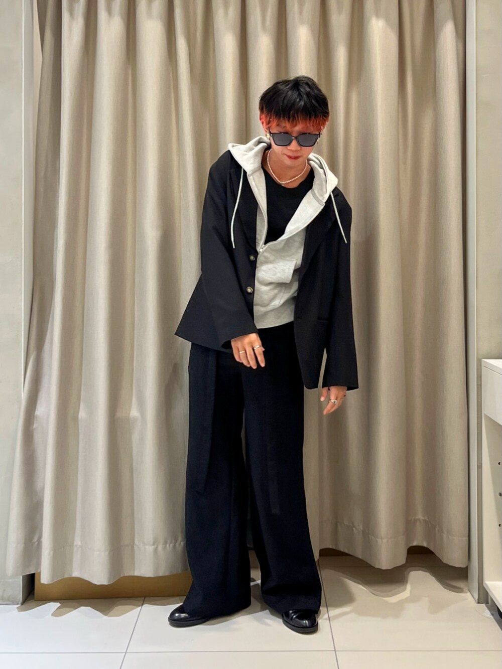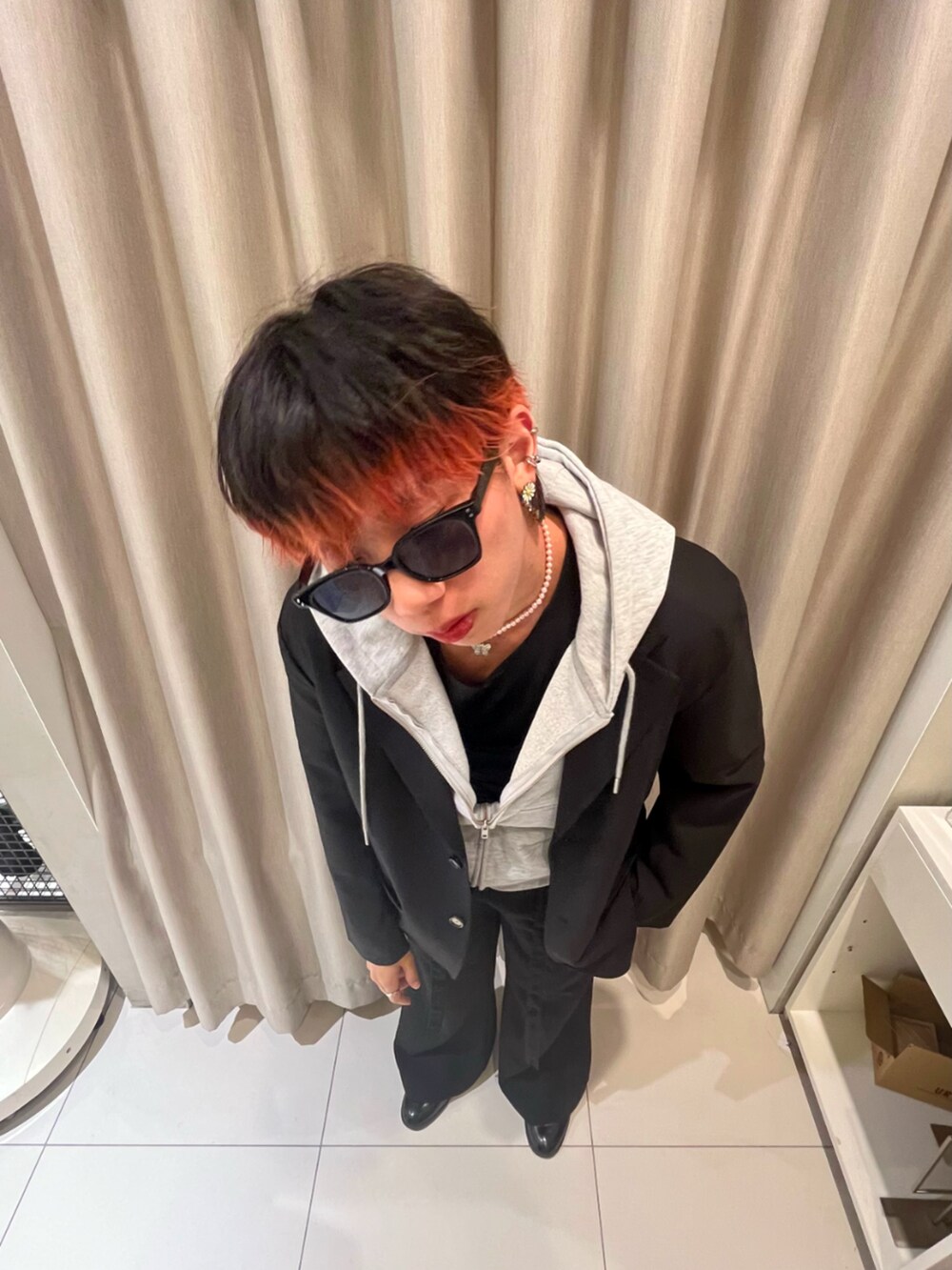 今回は、ノーカラージャケットの下にグレーのパーカーをいれてみました!