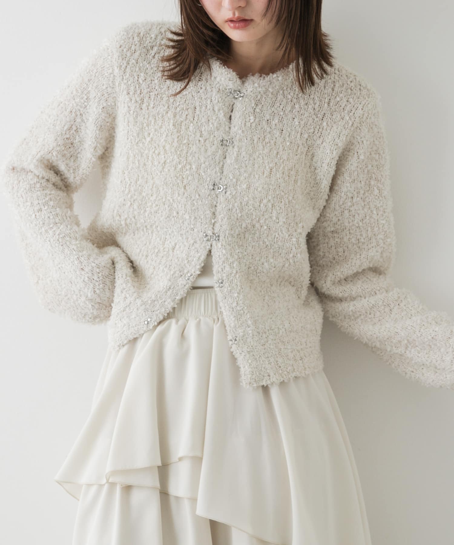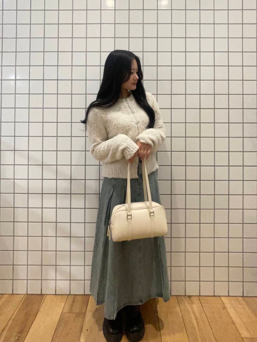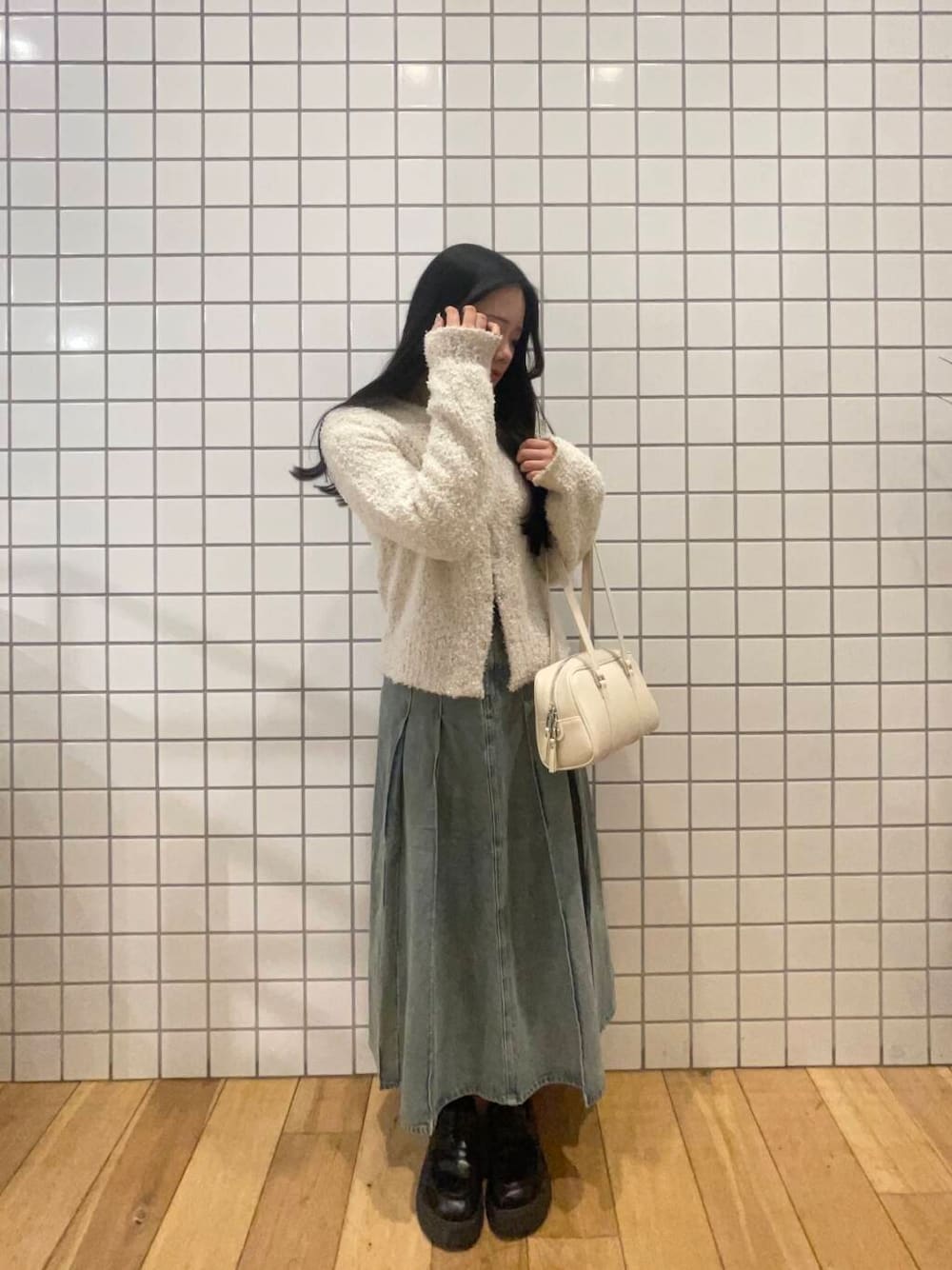 プリーツデニムスカートがひらひらでとってもかわいいです🩷カーディガンもフロントホックなのでおしゃれに色々な着方ができると思います!