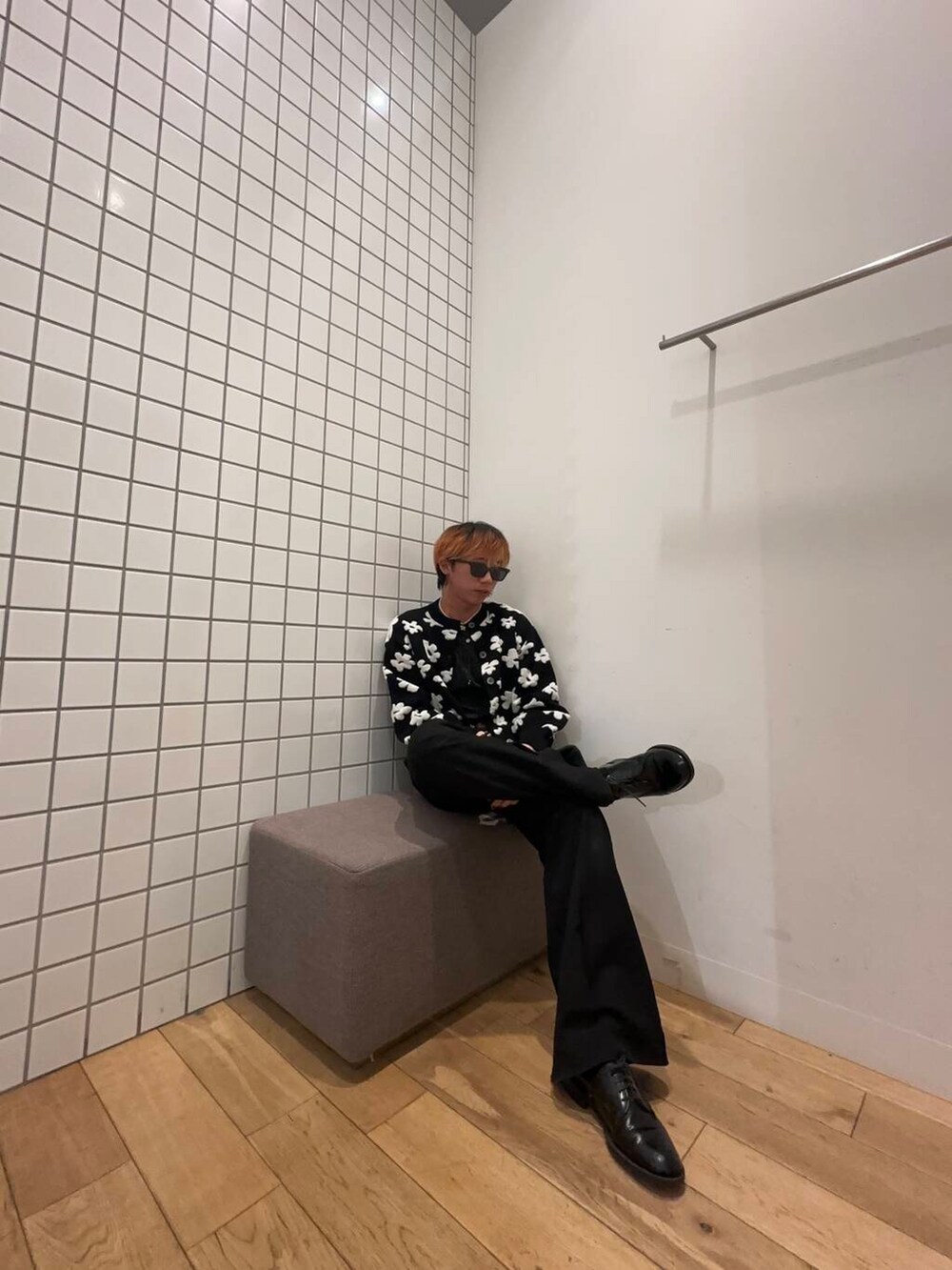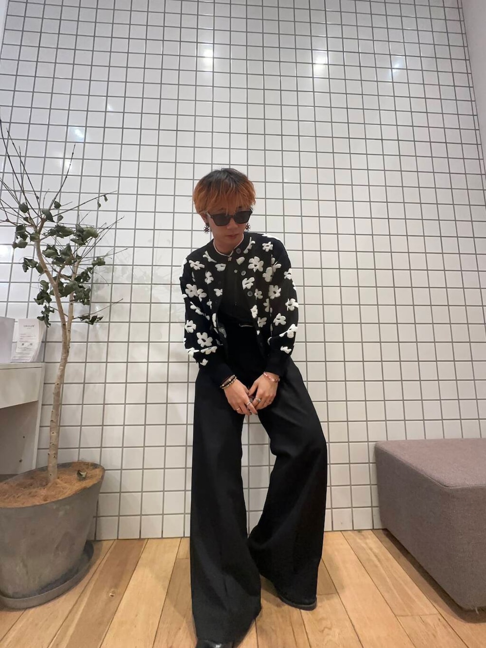 レディースのジャケットとトップスを使った少し暗めのコーデですが、ジャケットの花柄がいい味をだしてくれて可愛さアップです!