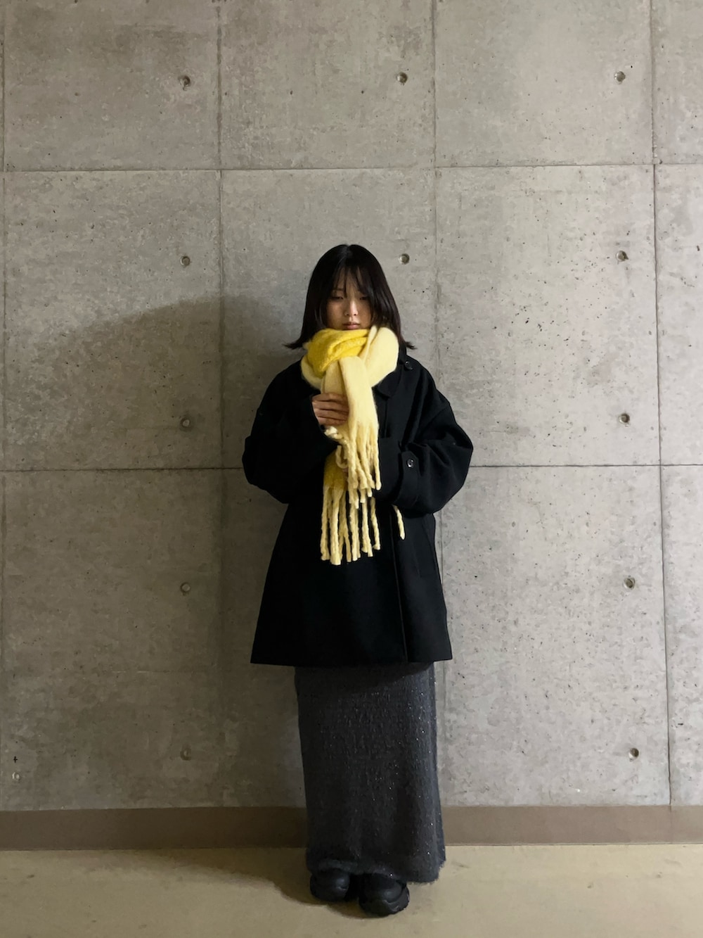 落ち着いたダークトーンでまとめた中に、ビビッドなイエローのマフラーがパッと映える冬コーデ。