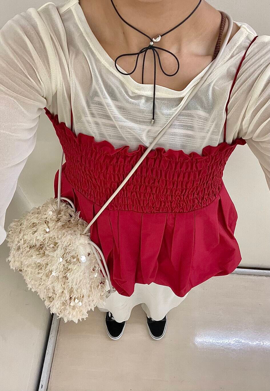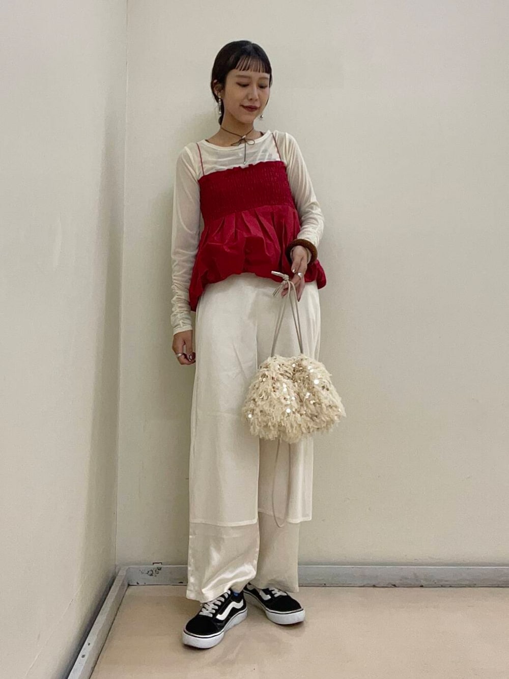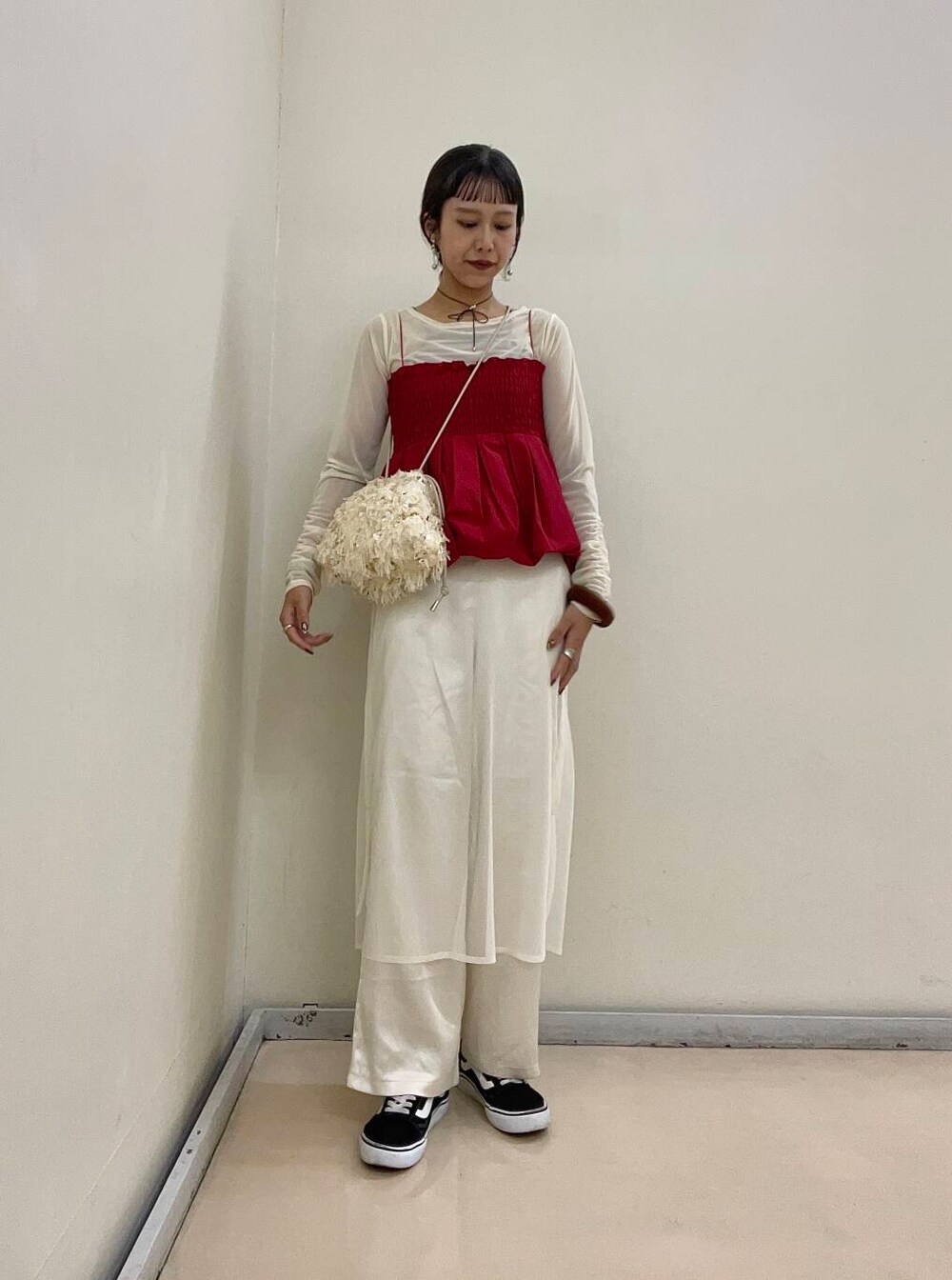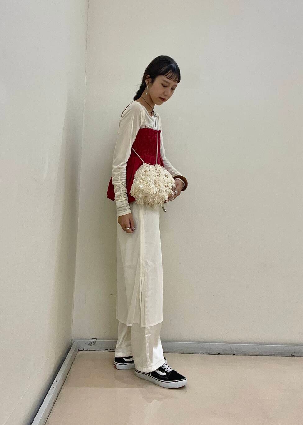 オールホワイトに差し色の赤を加えることで、コーデが一気に映えます!