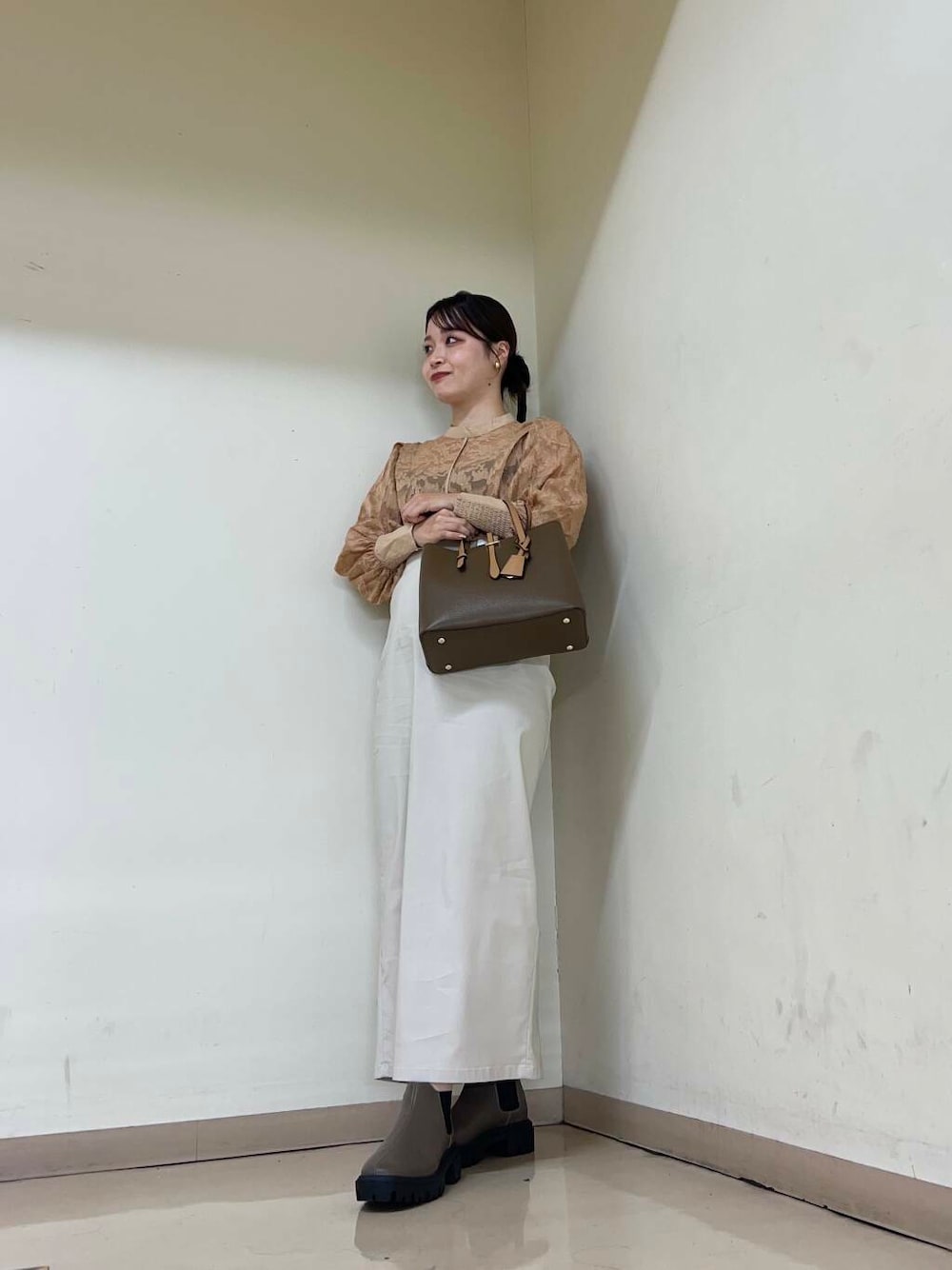 秋カラーを取り入れた綺麗めコーデに仕上げました🍂このブラウスはスカート合わせだと女性らしいフォーマルっぽく仕上がりますが、パンツスタイルでも大人カジュアルが作れるのでおすすめです!
