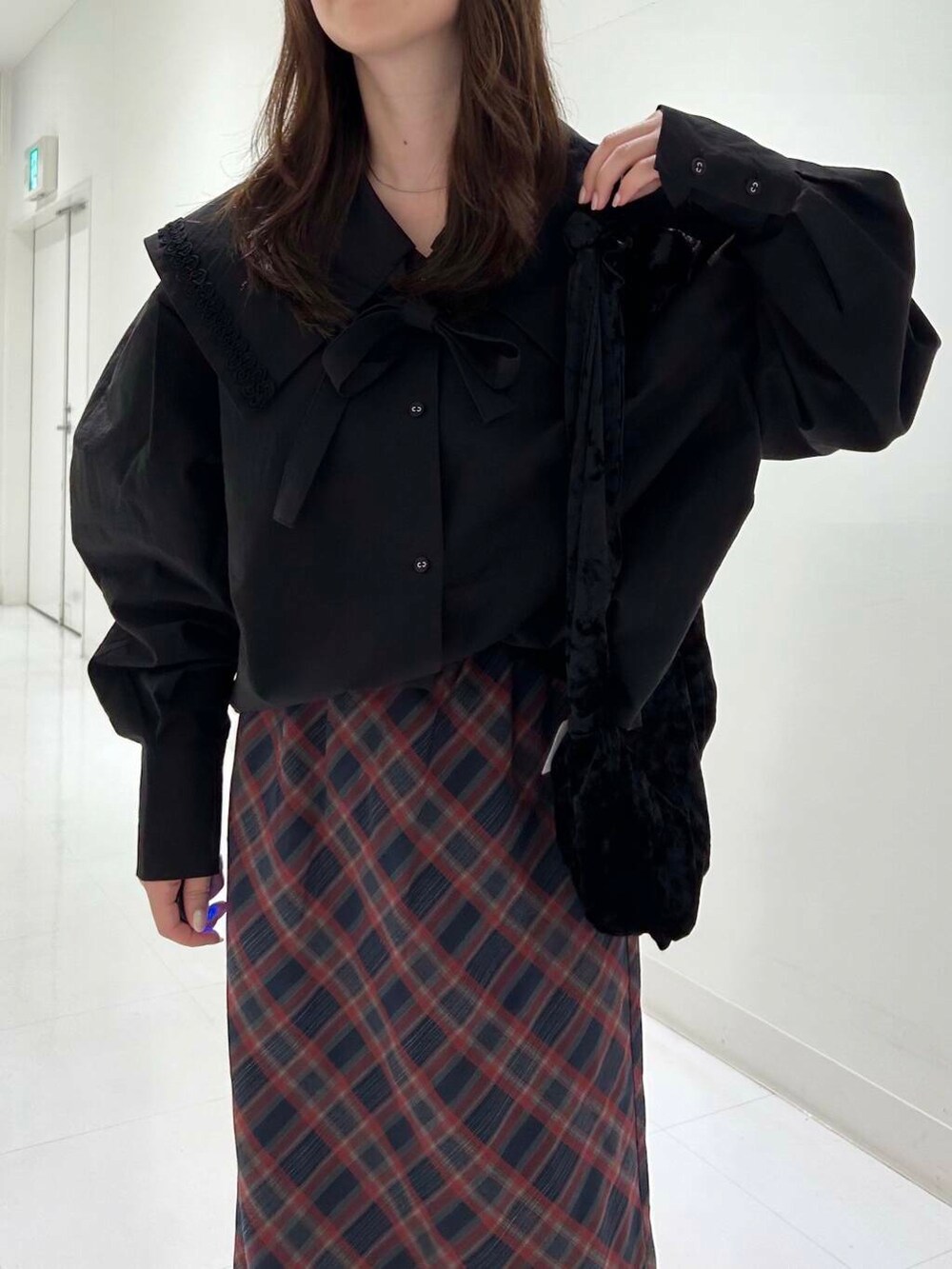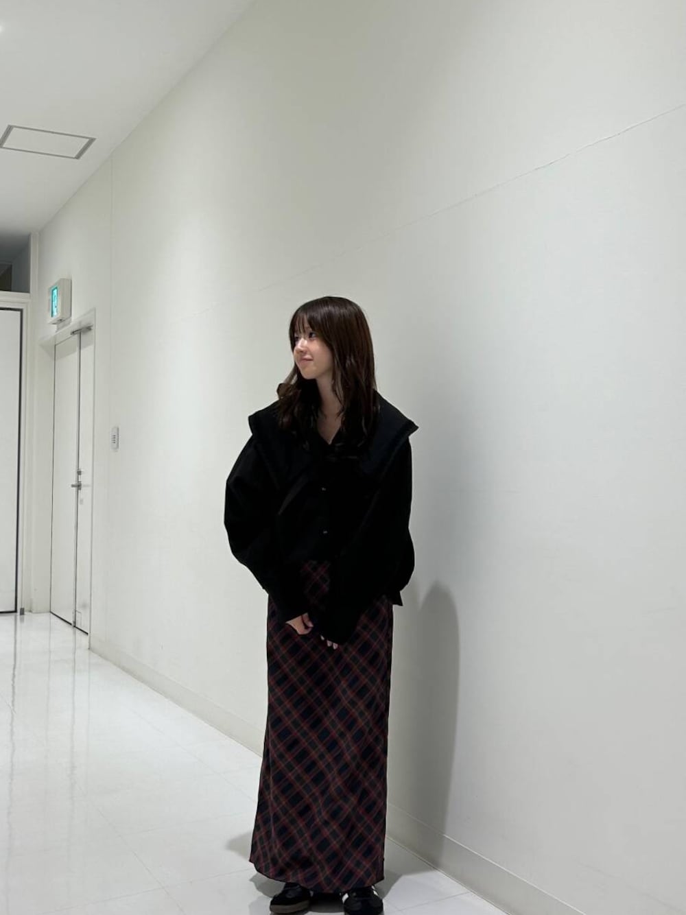 襟が大きいこのブラウスは、着るだけで小顔効果抜群です!!スカートは、体のラインが綺麗に見えるシルエットになっています。ウエストがゴムなので、楽にはいて頂けるのもポイントです!コーデにチェックを入れると、一気に秋っぽコーデが完成します✊🏻🍒
