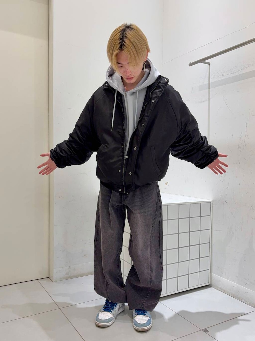 袖にあしらったギャザーが可愛いためレディース、メンズどちらとも合わせることが出来ます。ボリュームのある中綿で寒い今の季節にぴったりです。カジュアルスタイルのデニムに、トップスは短丈のジップパーカー、スニーカーと合わせてトレンド感を出しています。スニーカーだけでなくレザーシューズやブーツなど幅広く合わせることも出来ます!