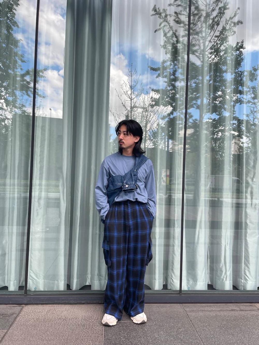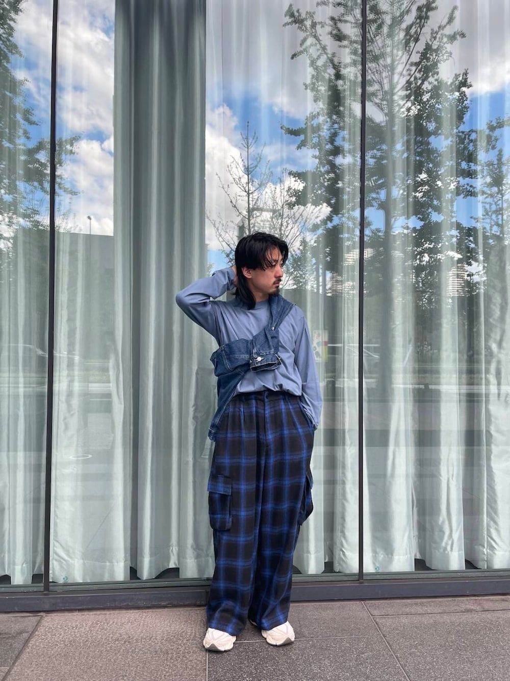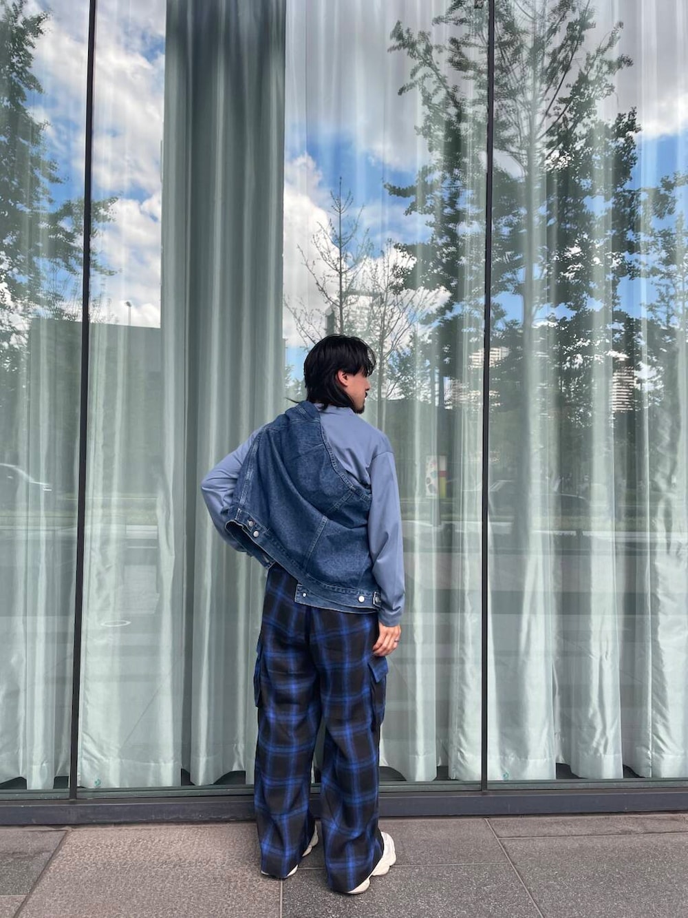 襷掛けをデニムジャケットでやるのがワンポイント!
