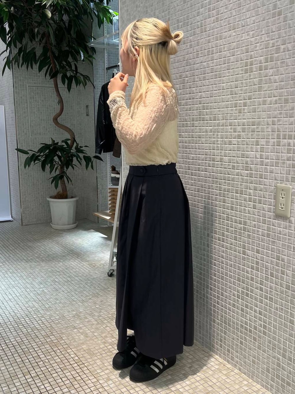 新作のプリーツスカート、