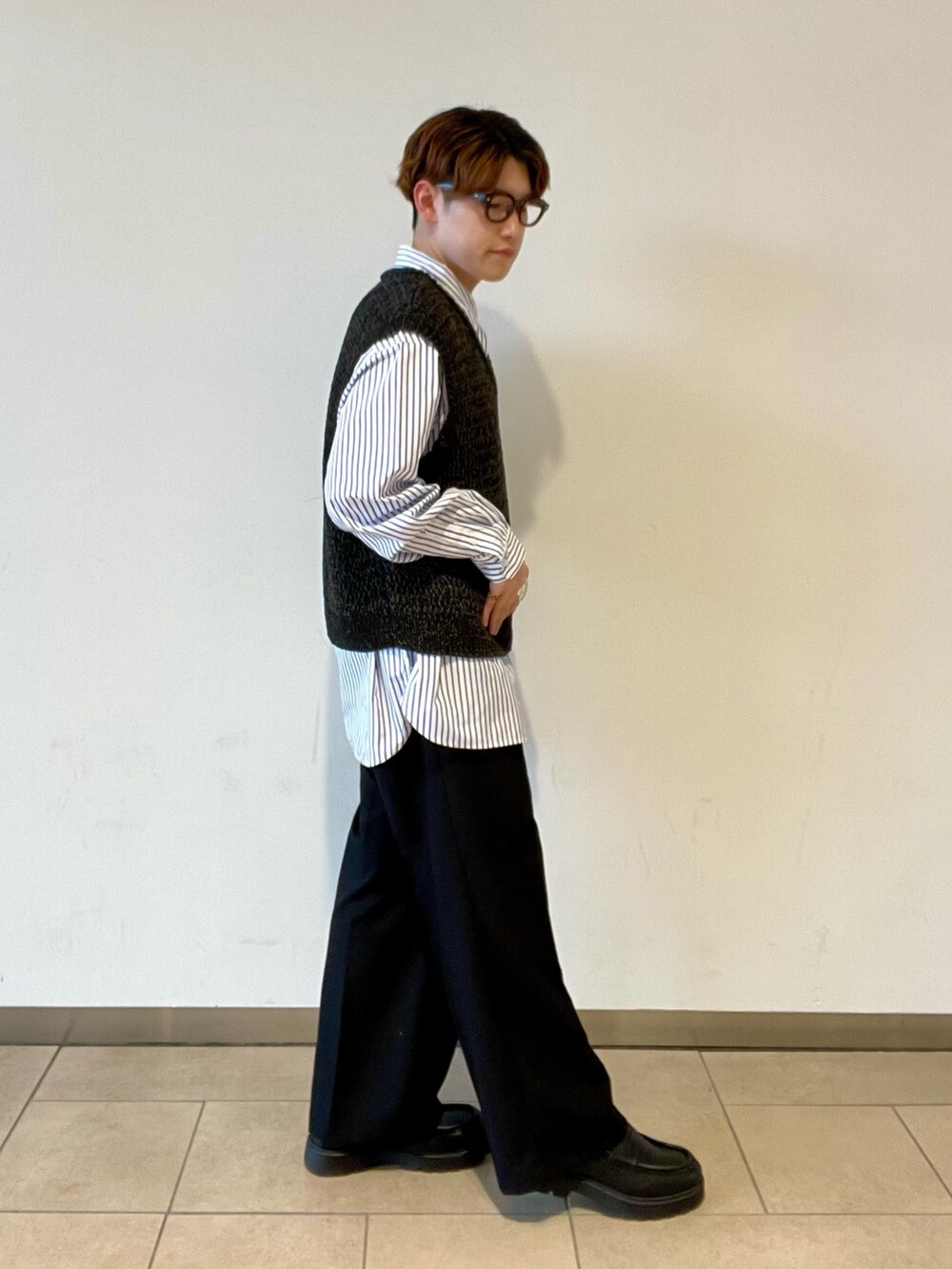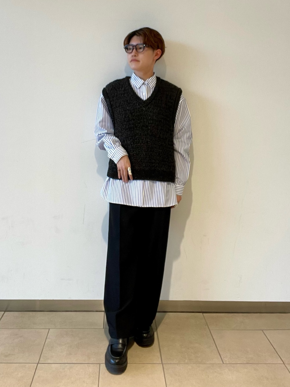 コーデのアクセントになるミックスカラーのニットベストはシャツやTシャツとレイヤードスタイルがオススメです👍