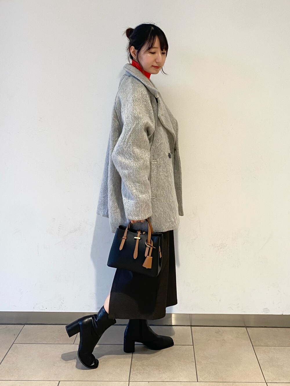 シャギーコートは少しゆったり目でボタンを閉めればスタンドカラーになります!