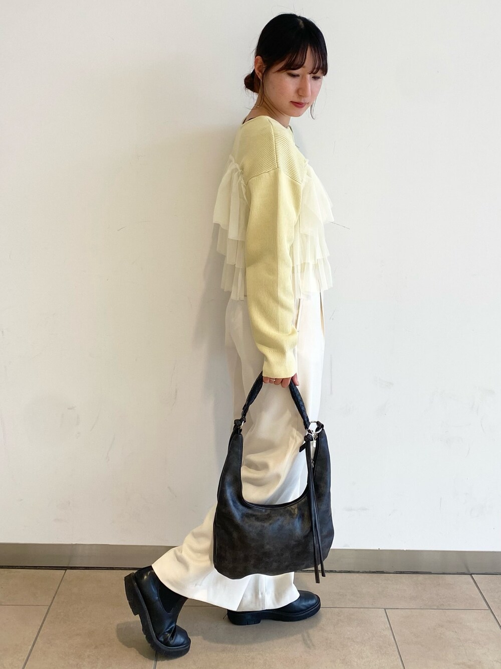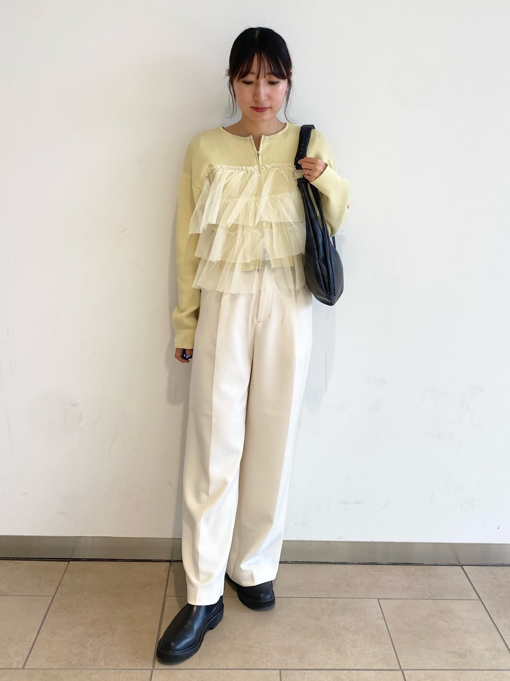 トップスが可愛らしい分、スラックスで少しカジュアルにしました!