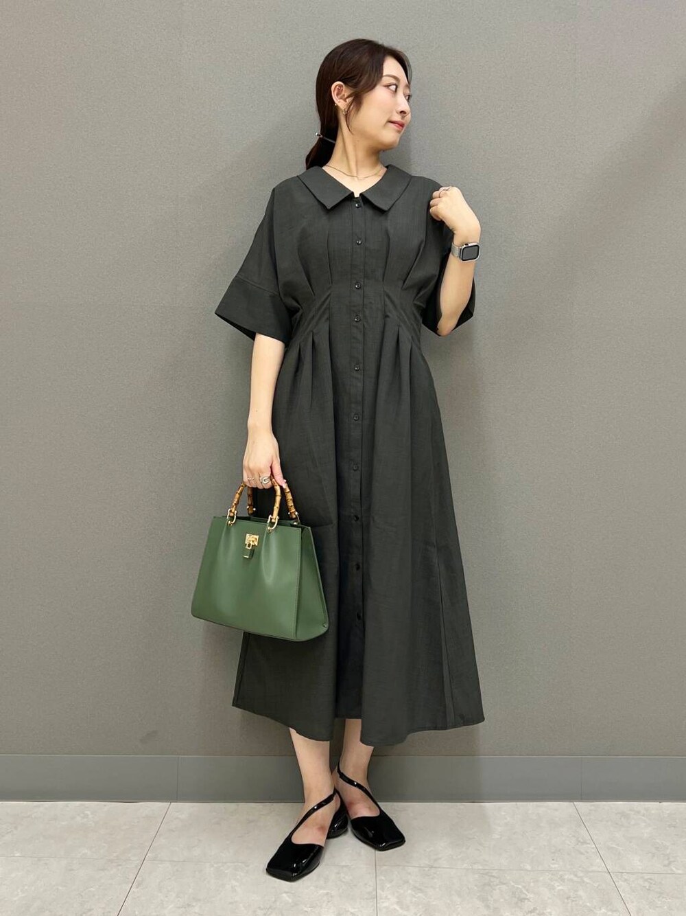 夏のワンピースですが、暗めカラーのチャコールは小物次第で秋にも着ていただけます◎