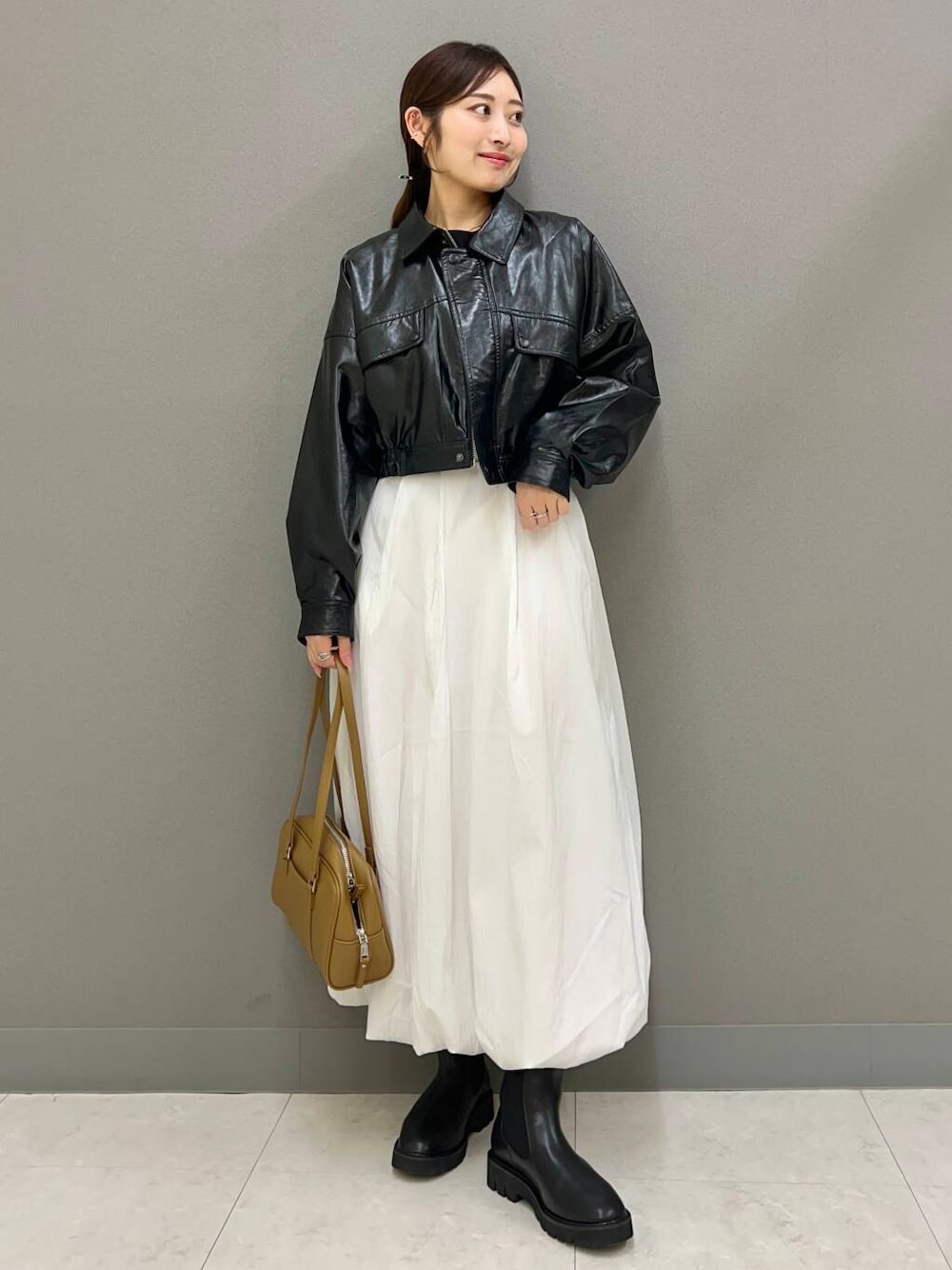 短めの丈のレザージャケットと合わせて、強くなりすぎず大人っぽいコーデにしました!