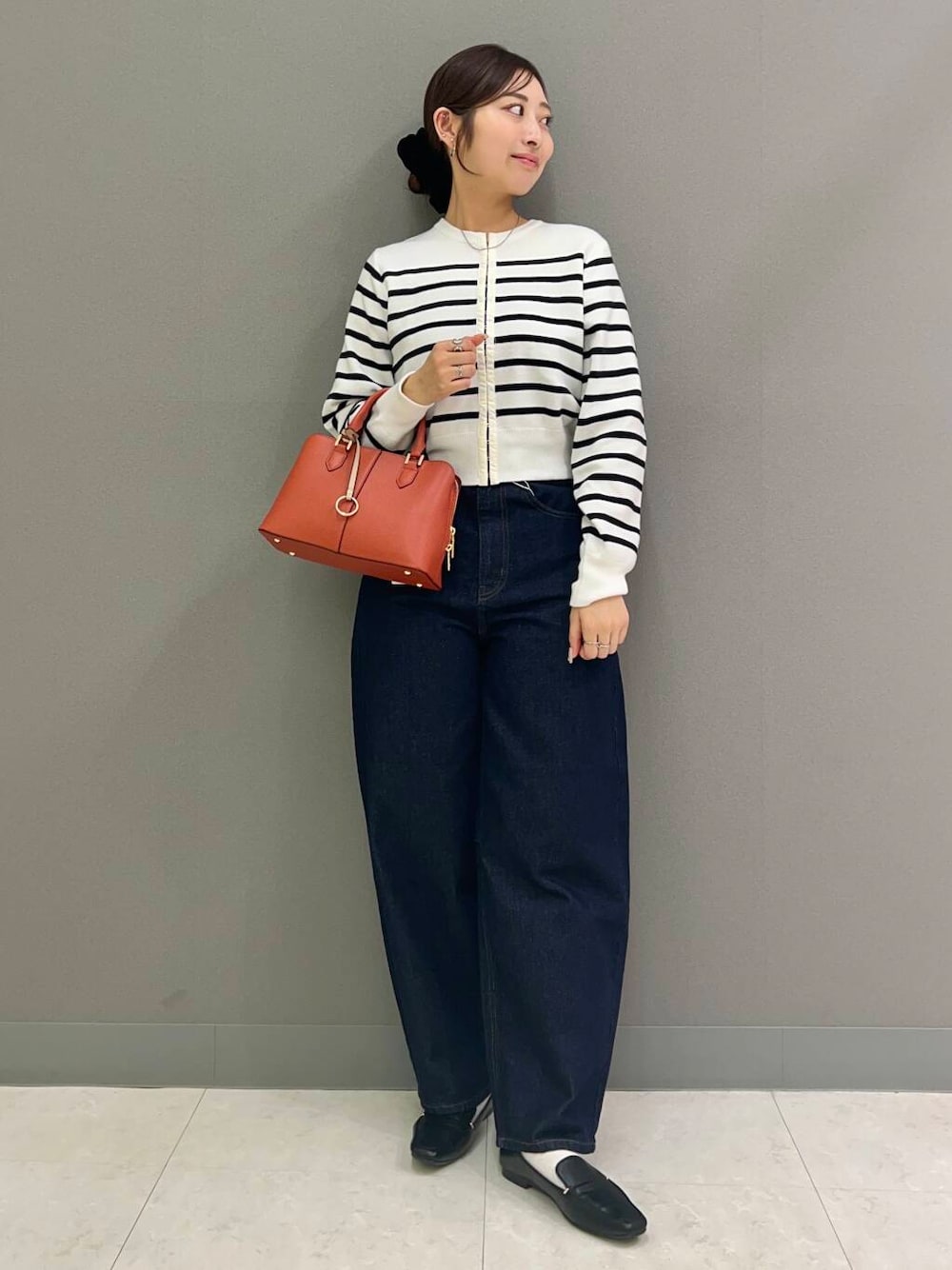 差し色に暖色カラーのバッグを取り入れて、寂しくならないように◎
