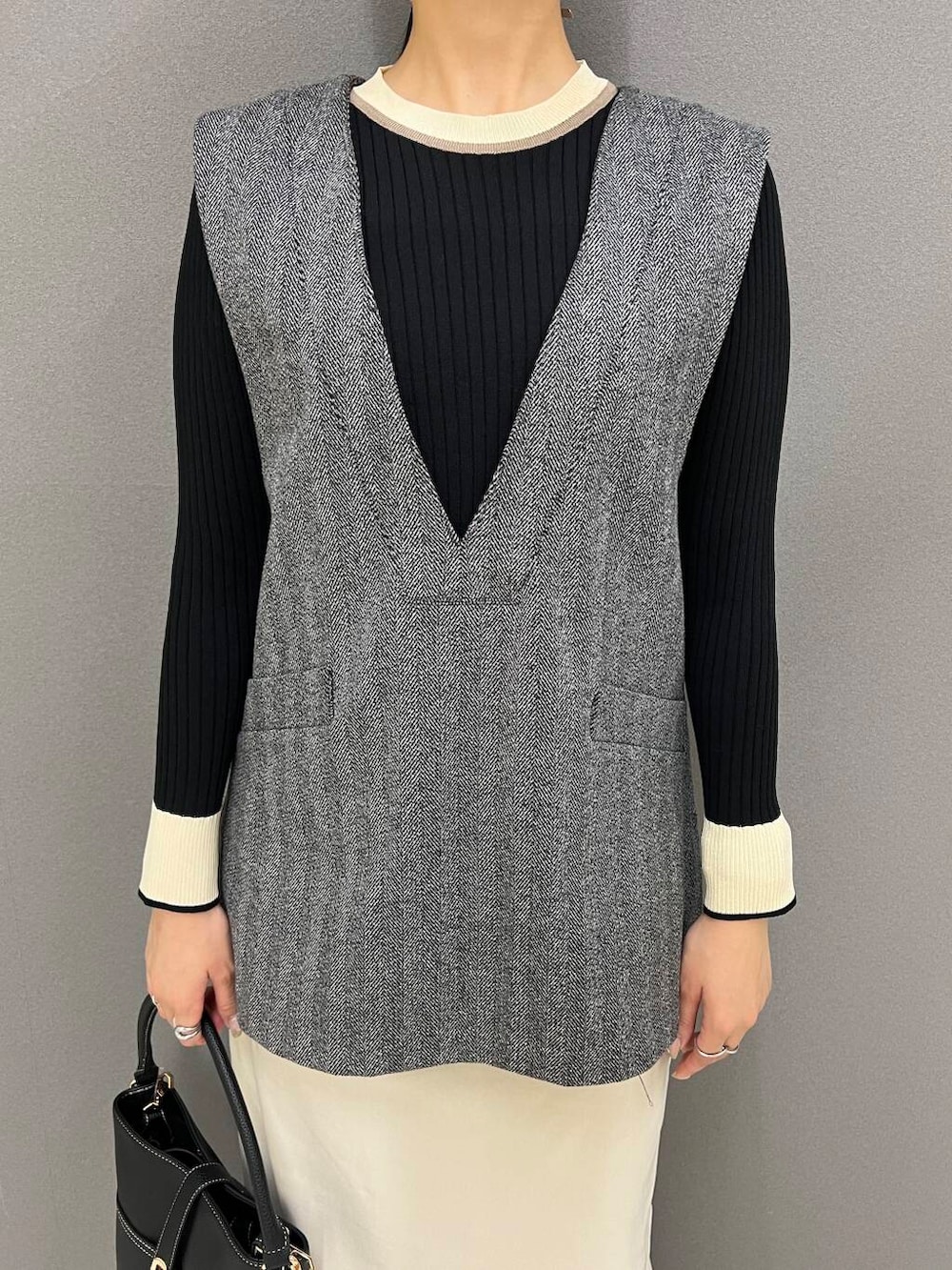 人気のジレとバイカラーコンパクトセーターの組み合わせ◎
