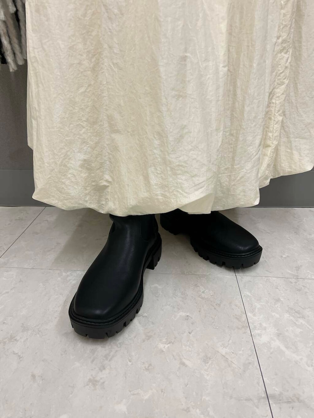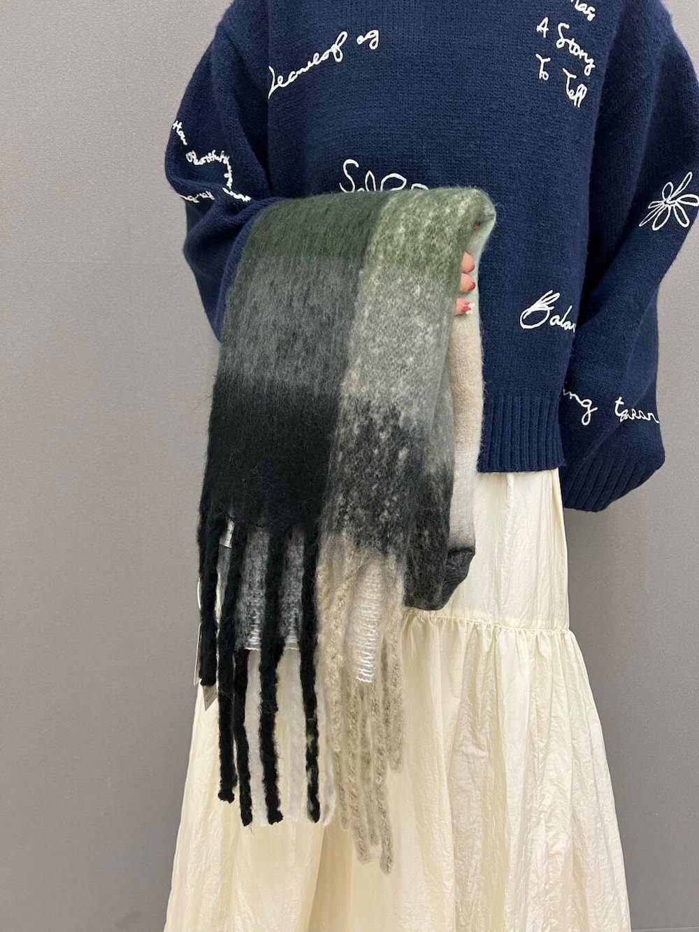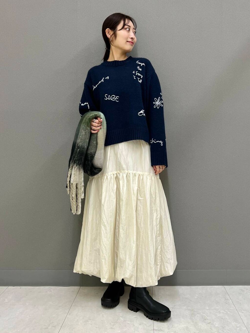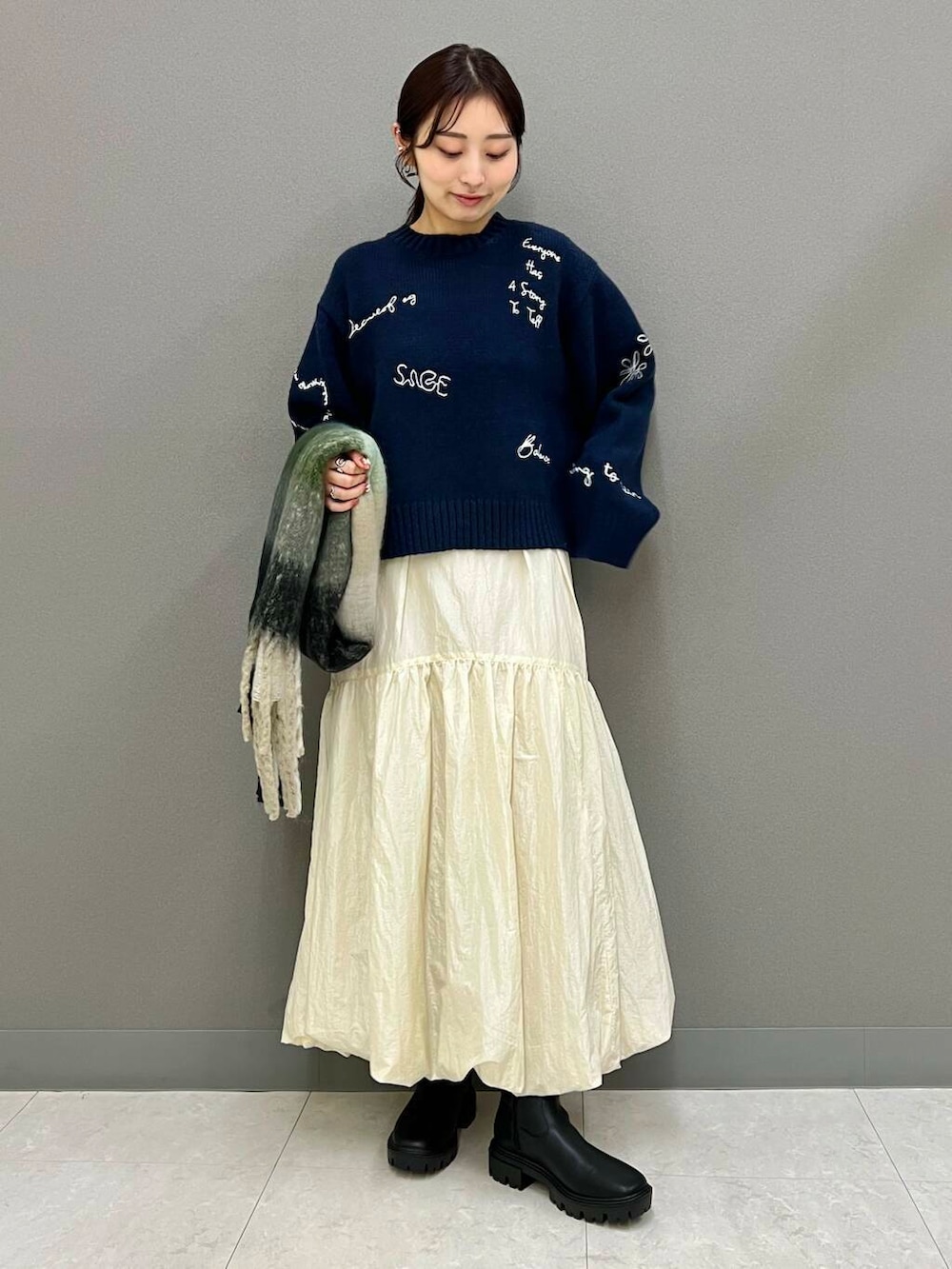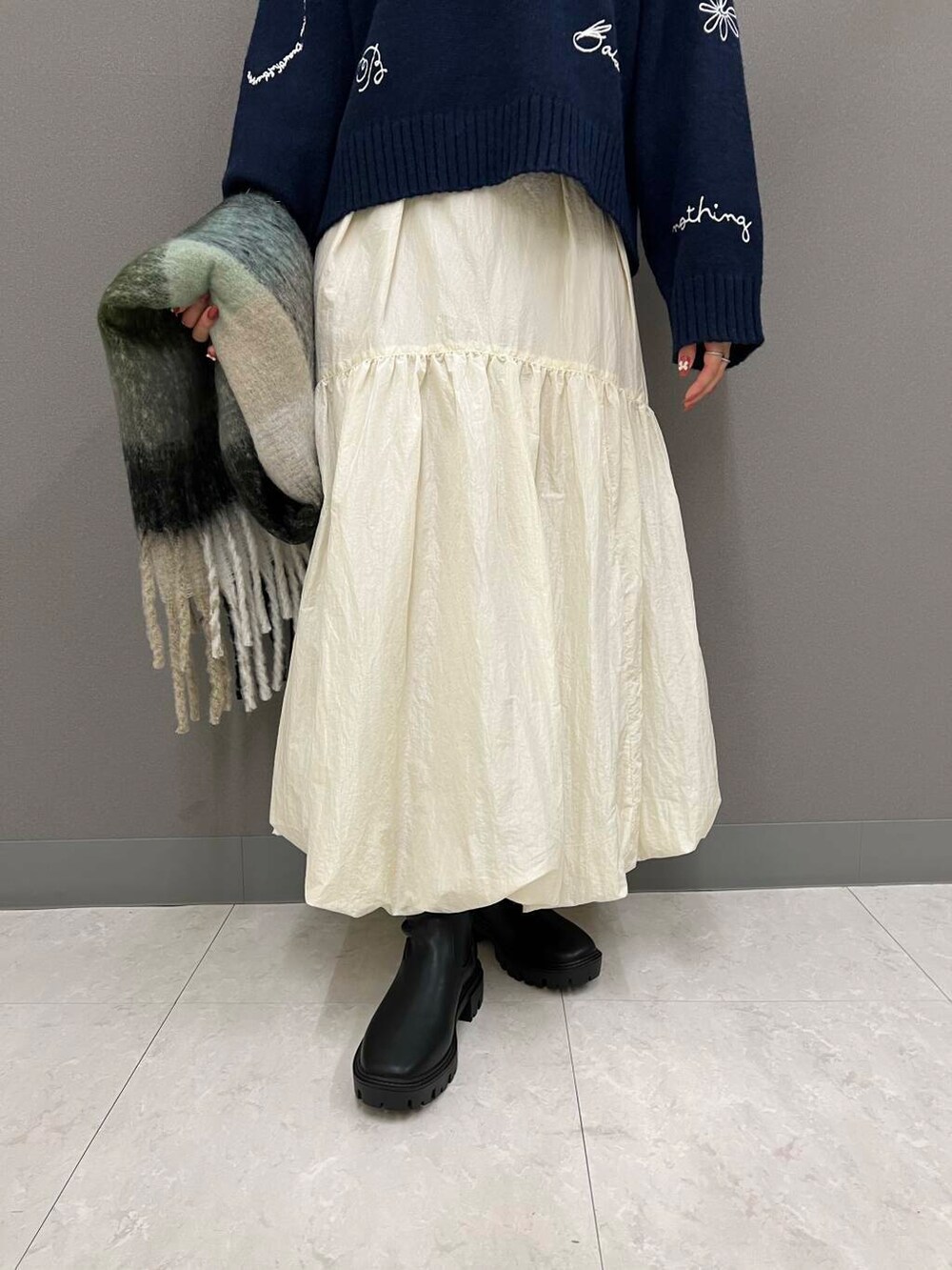 ブーツやストールを合わせて一気に冬らしさを演出しました✨