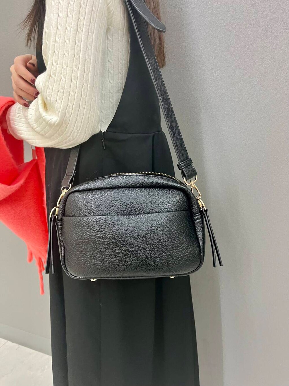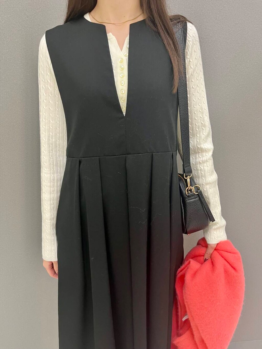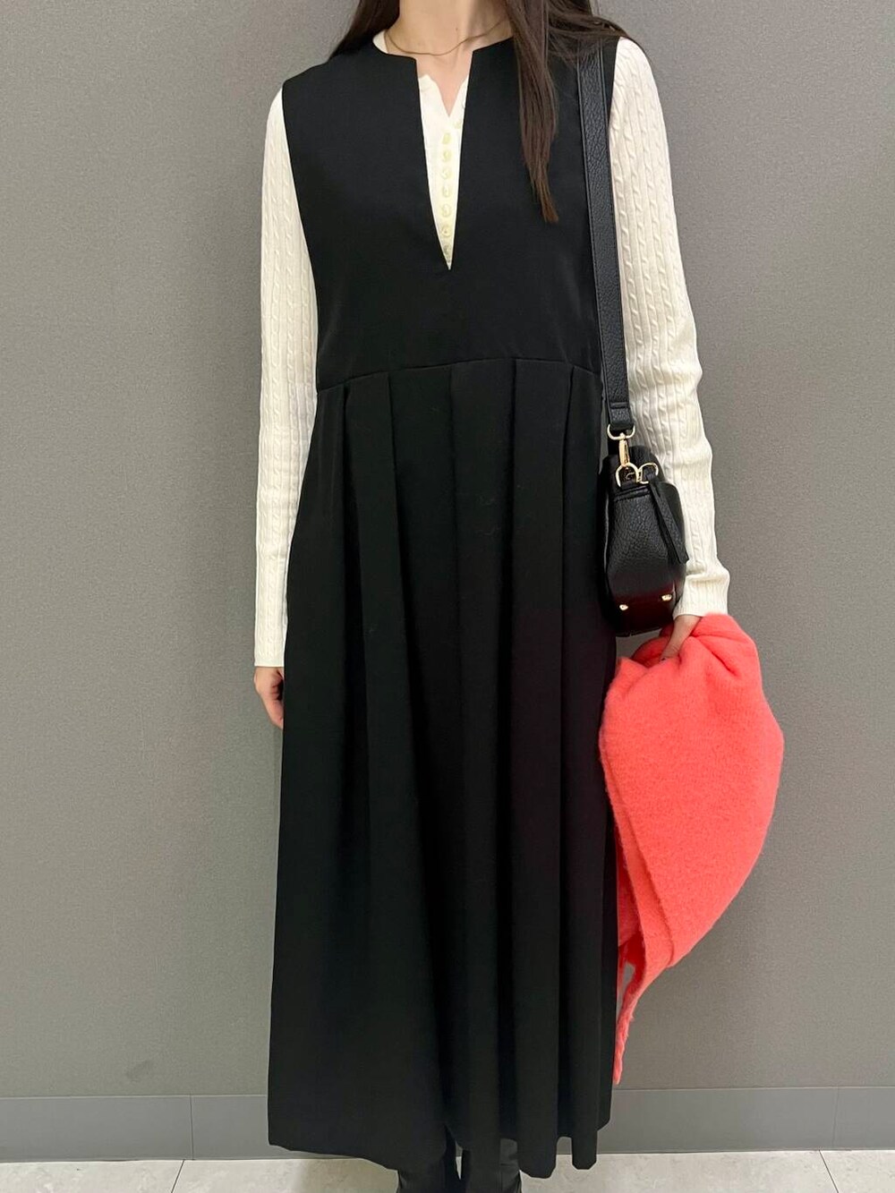 中のニットは着るだけで細見えするので