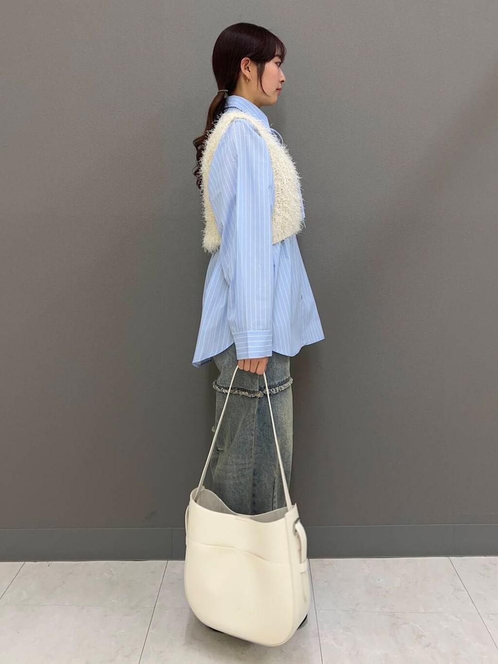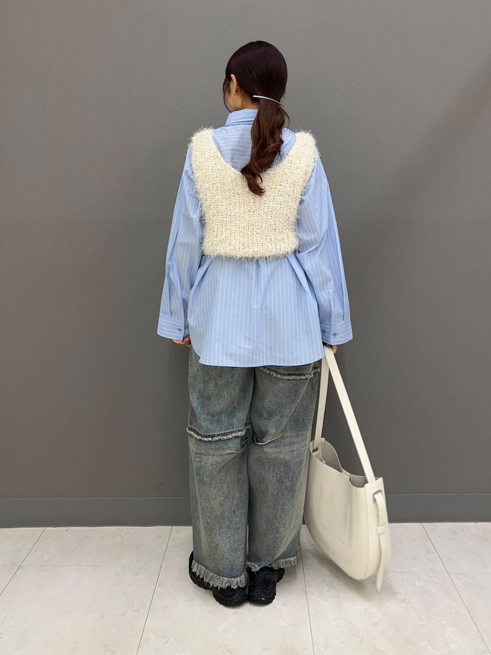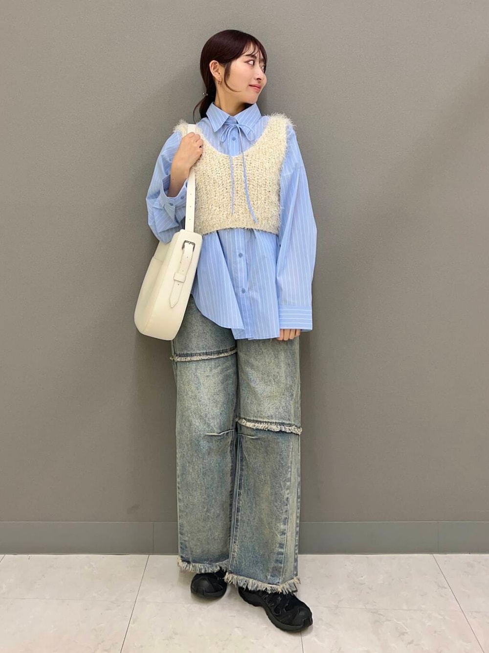 コード付きのシャツと、フェザーのベストはそれぞれ撮っても着回しが利くアイテムです◎