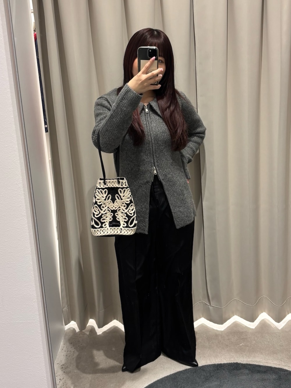 キレイめの形のパンツやブーツと合わせて全体的にモノトーンで大人綺麗めなコーデになっています!