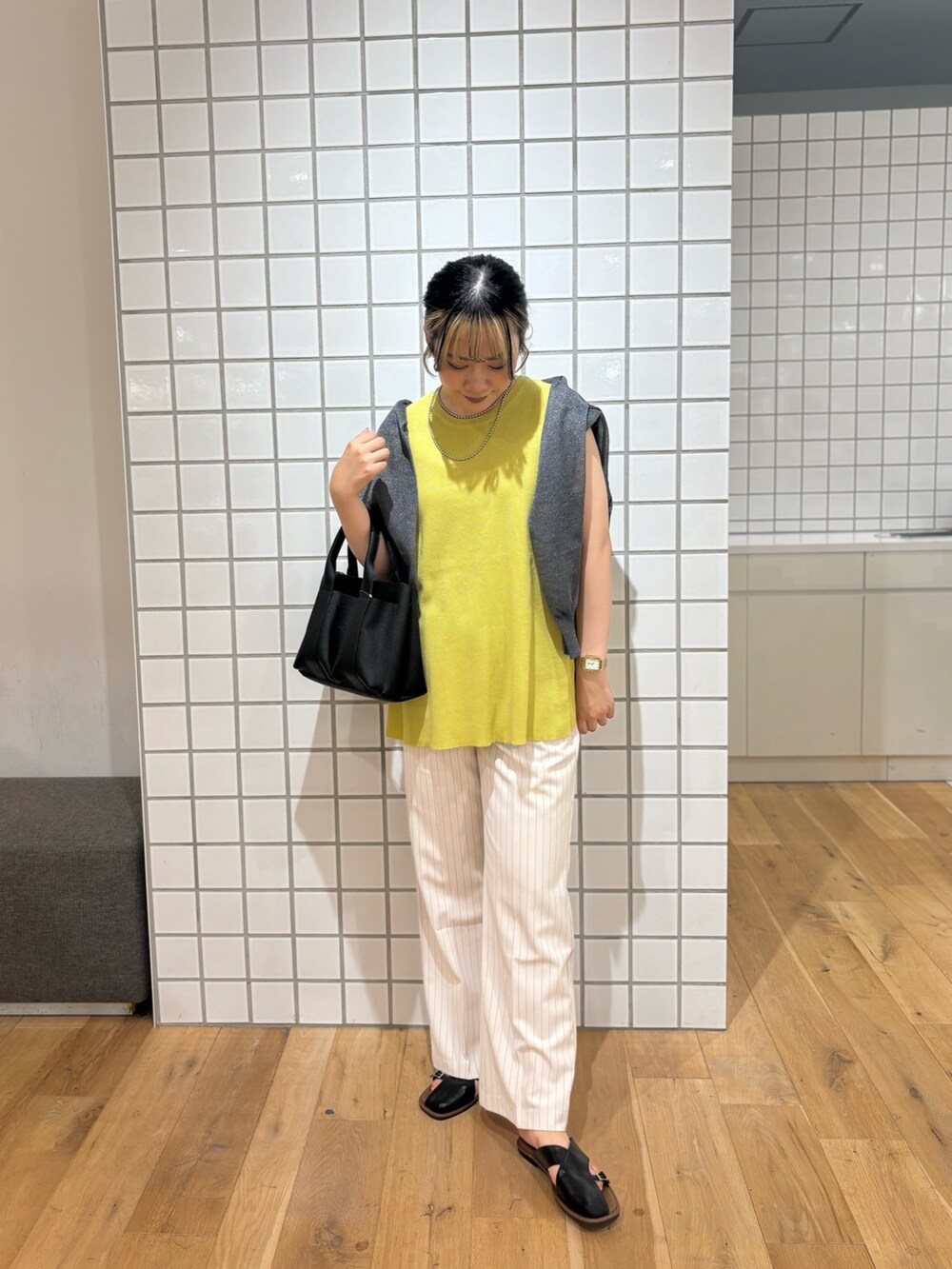 トップスが綺麗なカラーアイテムなので他のアイテムは映えるようにモノトーンでまとめてみました!