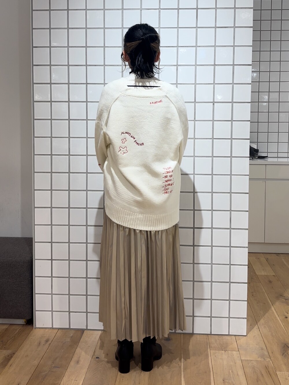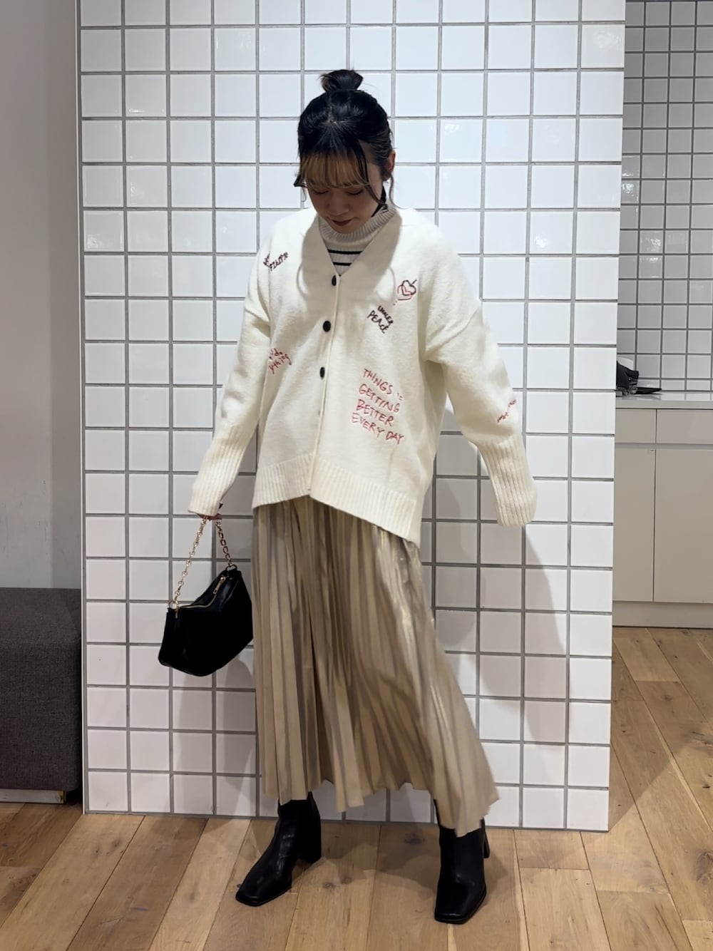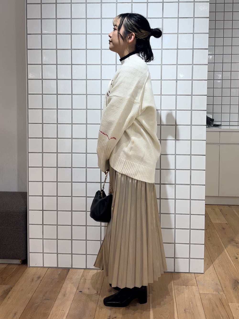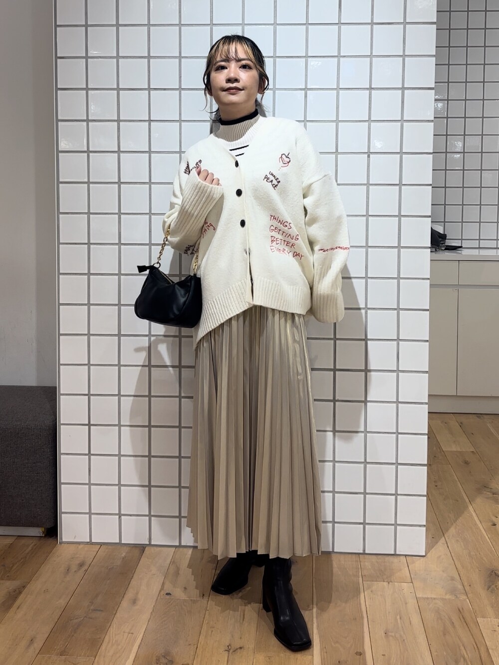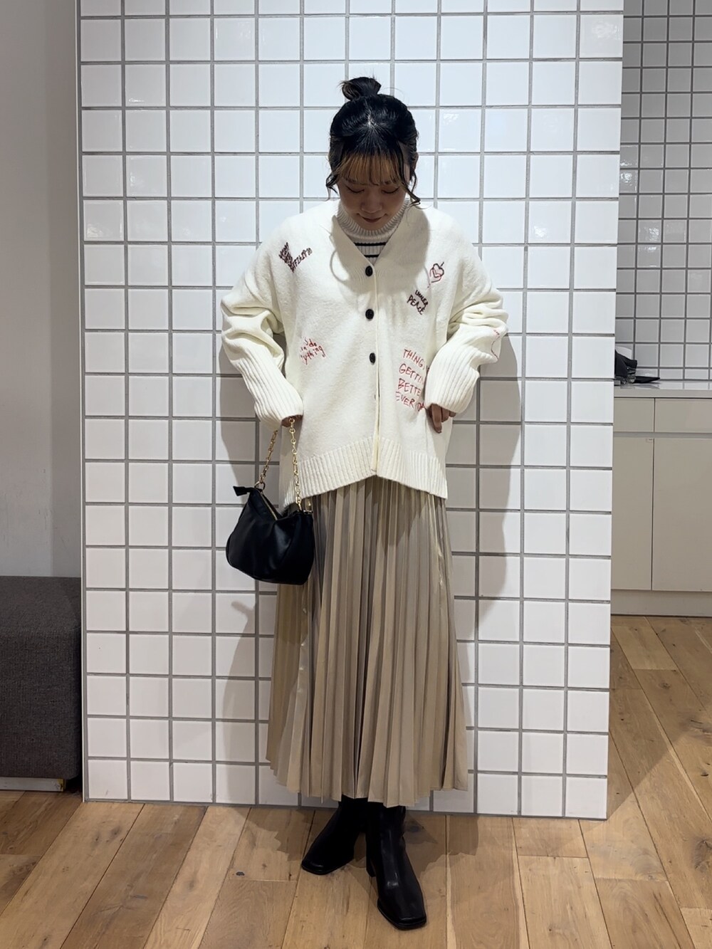 プリーツスカートは光沢感があるので履くだけで主役級です✨️