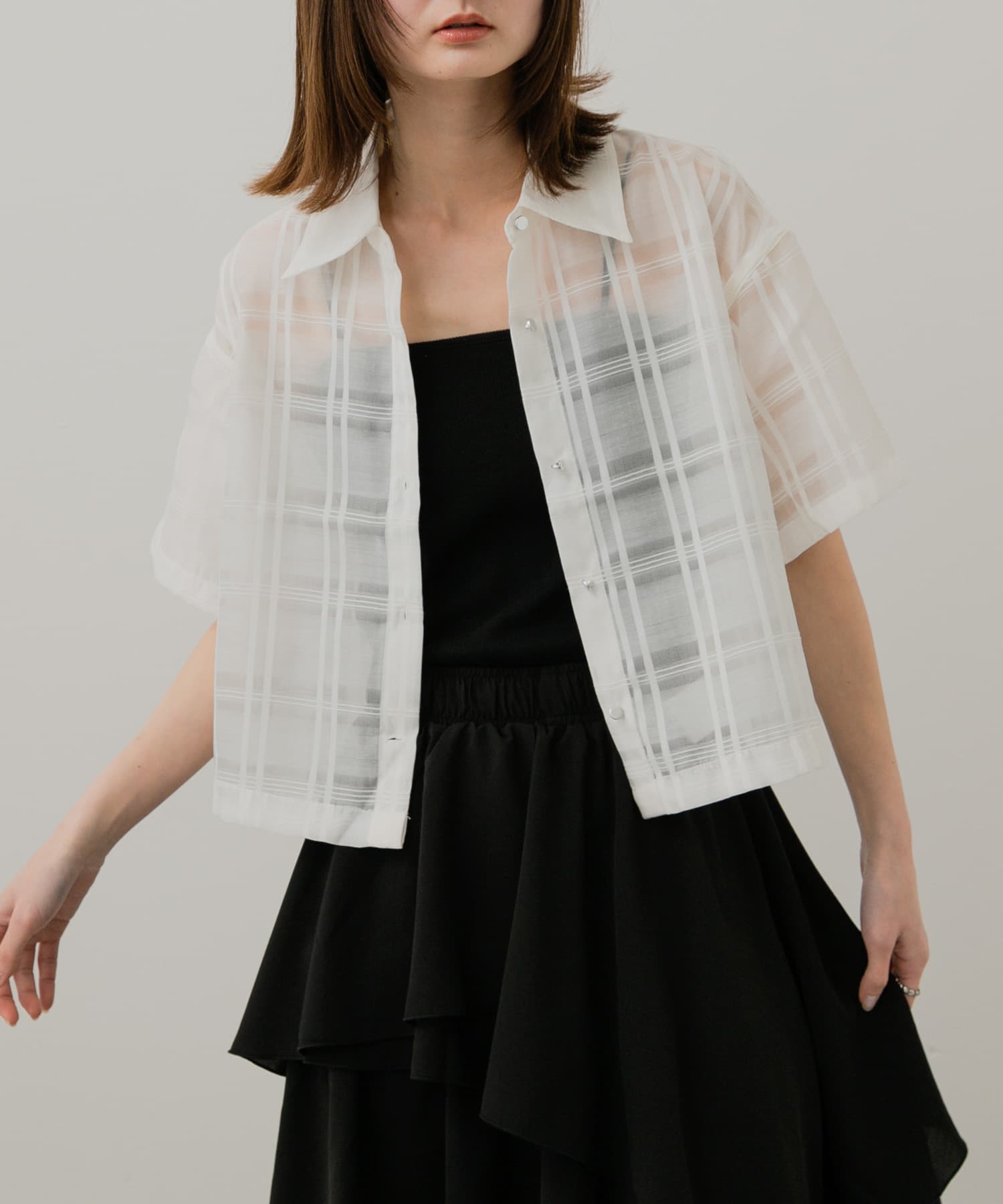 シアーシャツはチェック柄が入っているので、1枚でオシャレみえするアイテムです!