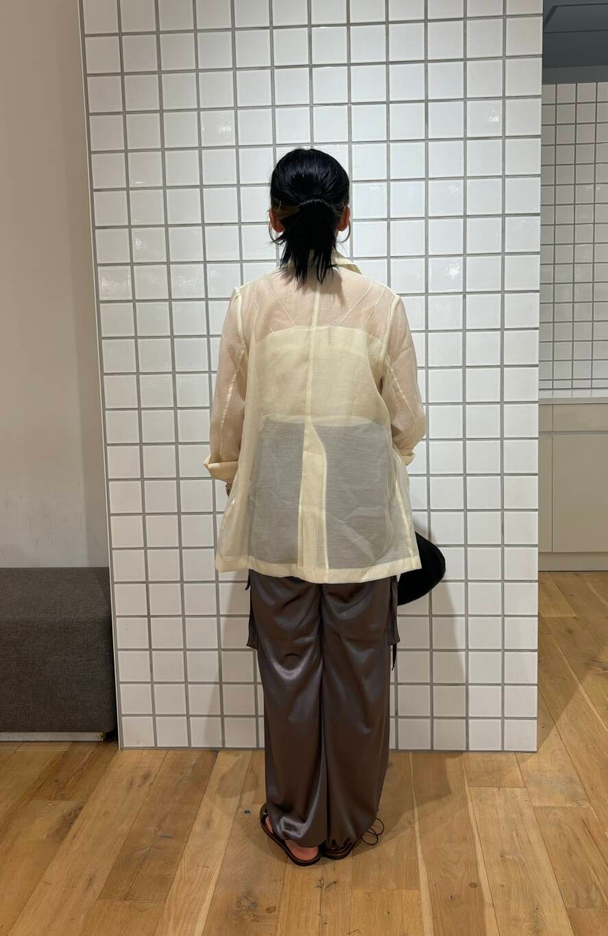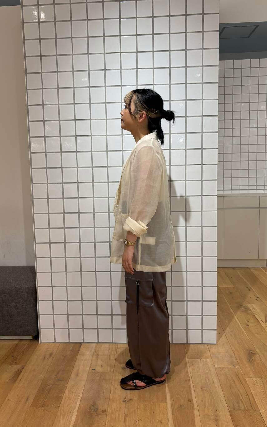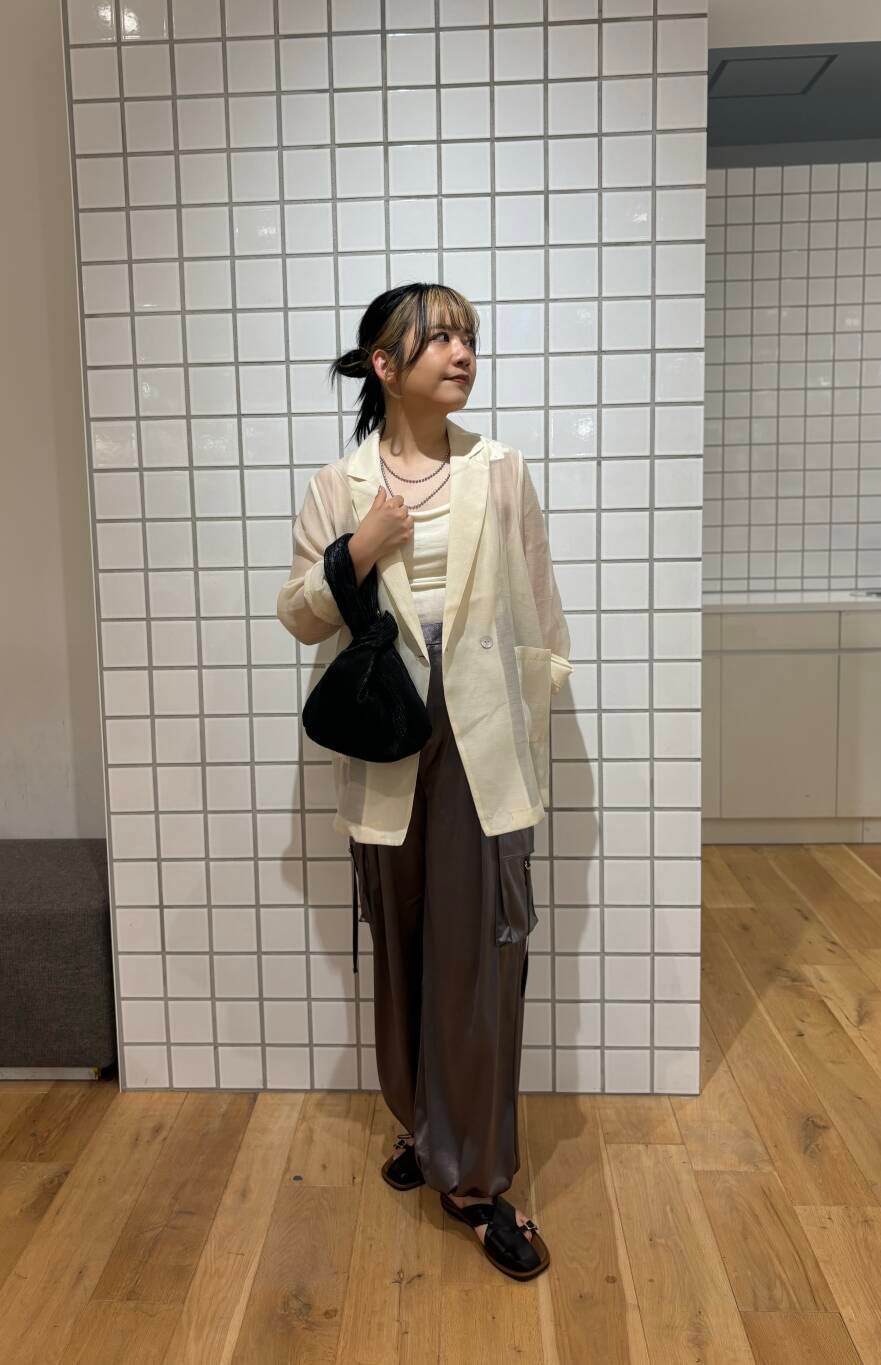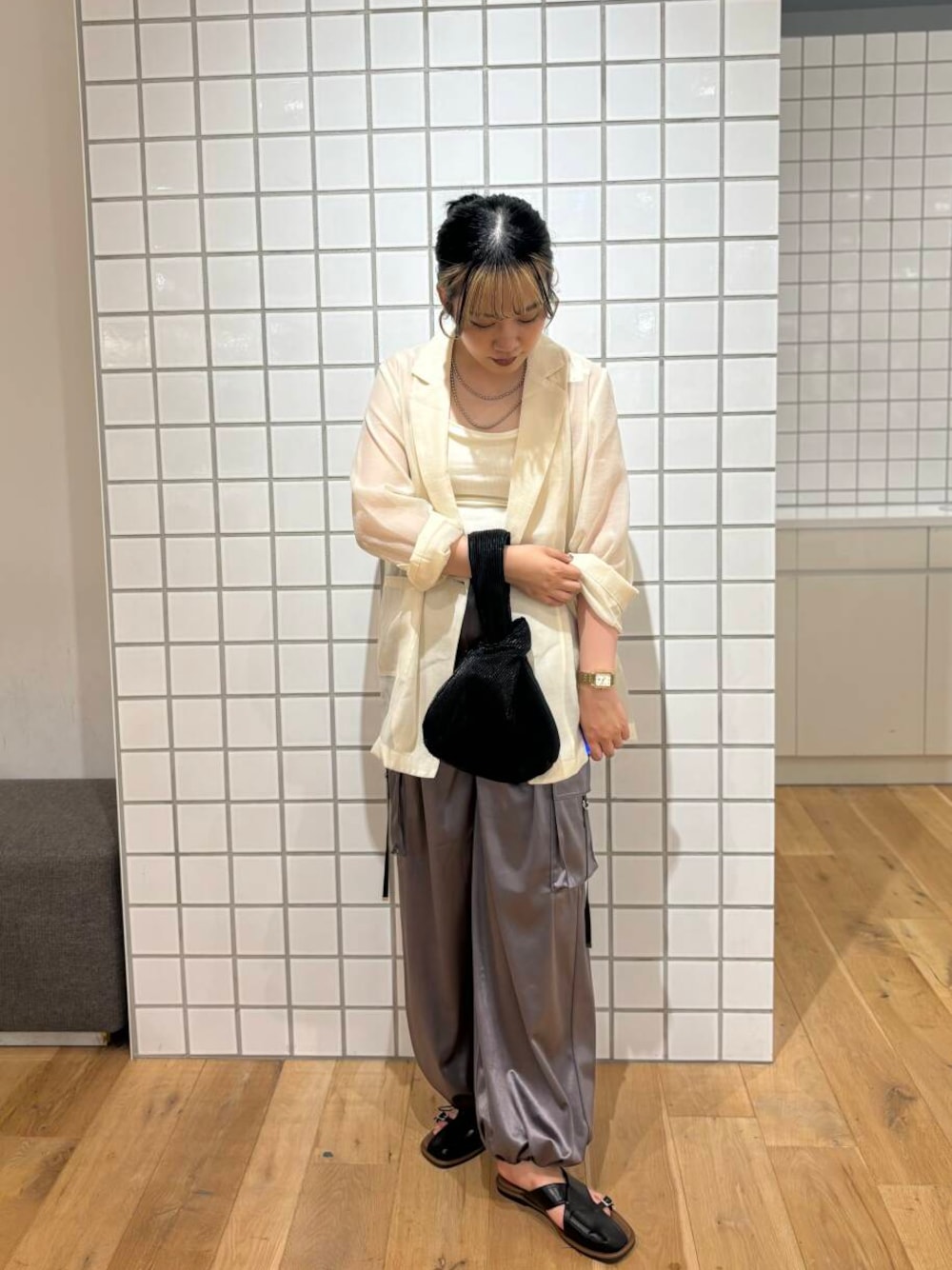 カーゴ系の素材としては珍しいツヤ感のあるボトムスは、ウエストもゴムなのでストレスフリーで、下の部分もドロストでお好みで調節できるので、体型が気になる方にもおすすめです!👍🏻